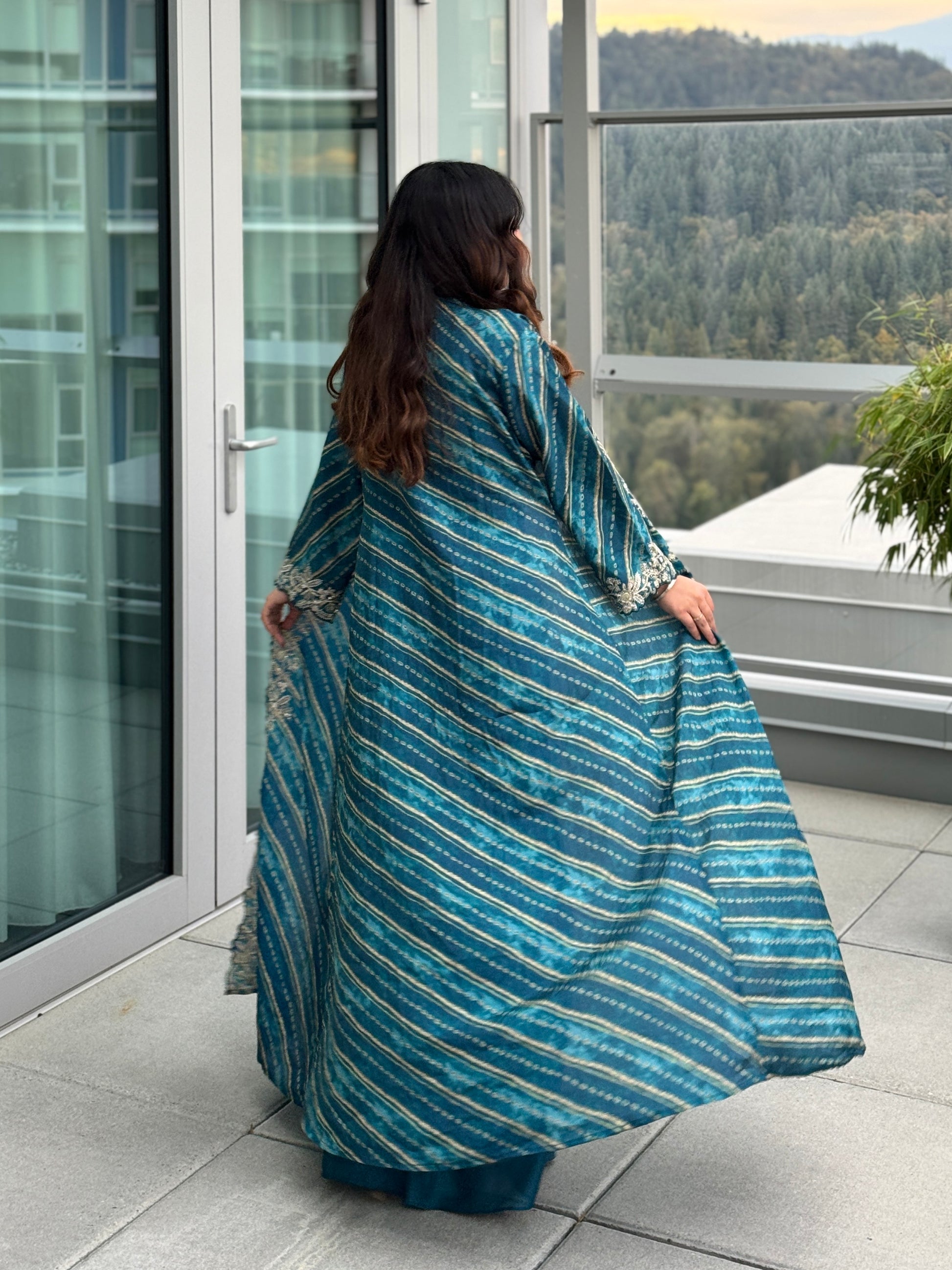 A deep teal symphony of grace — Aabha embodies quiet confidence and timeless charm. The intricately hand-embellished mirror details shimmer like reflections of moonlight over calm waters, paired with a flowing palazzo skirt and cape that drape like poetry in motion.