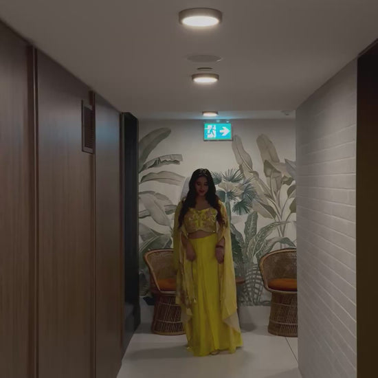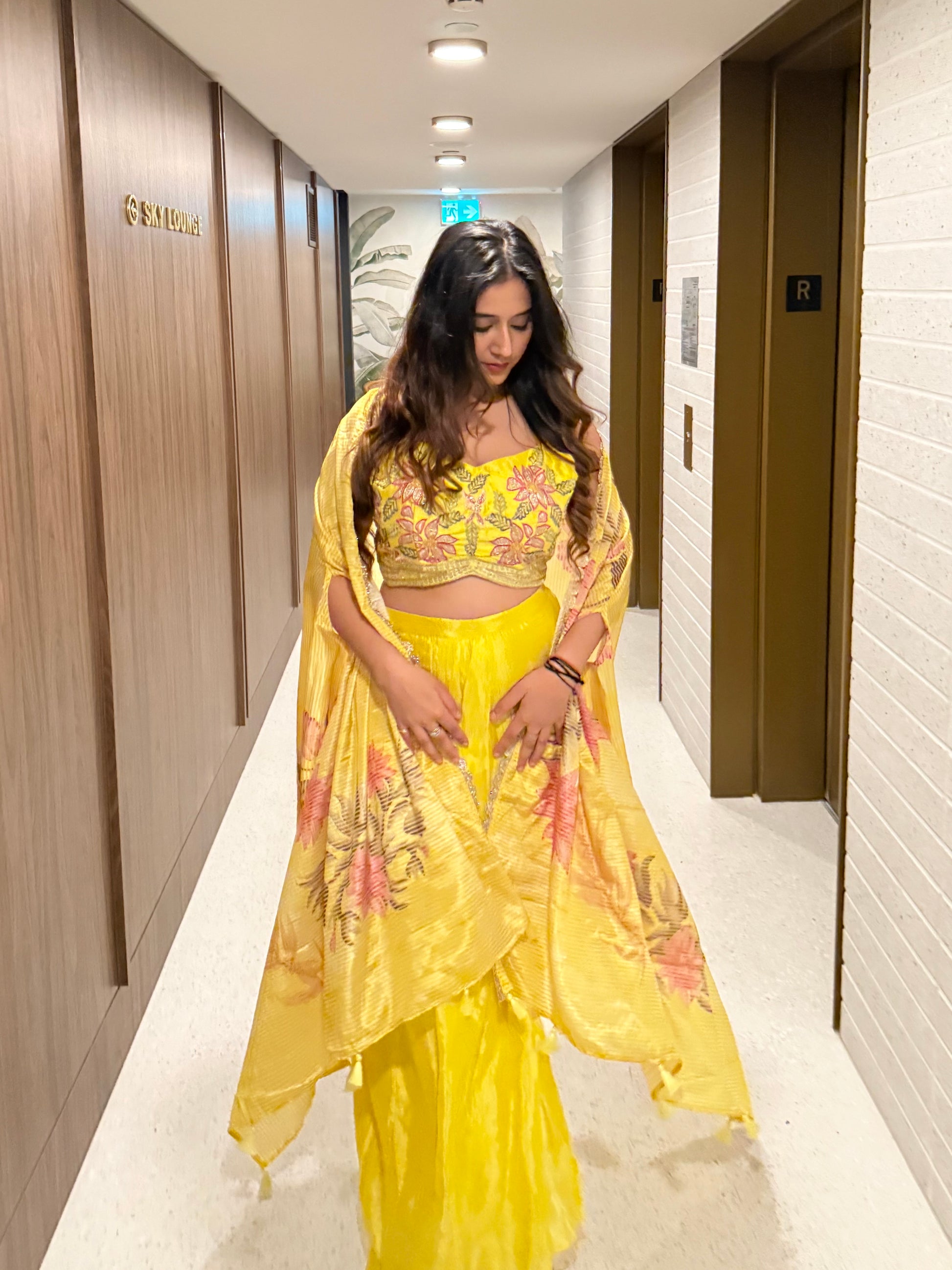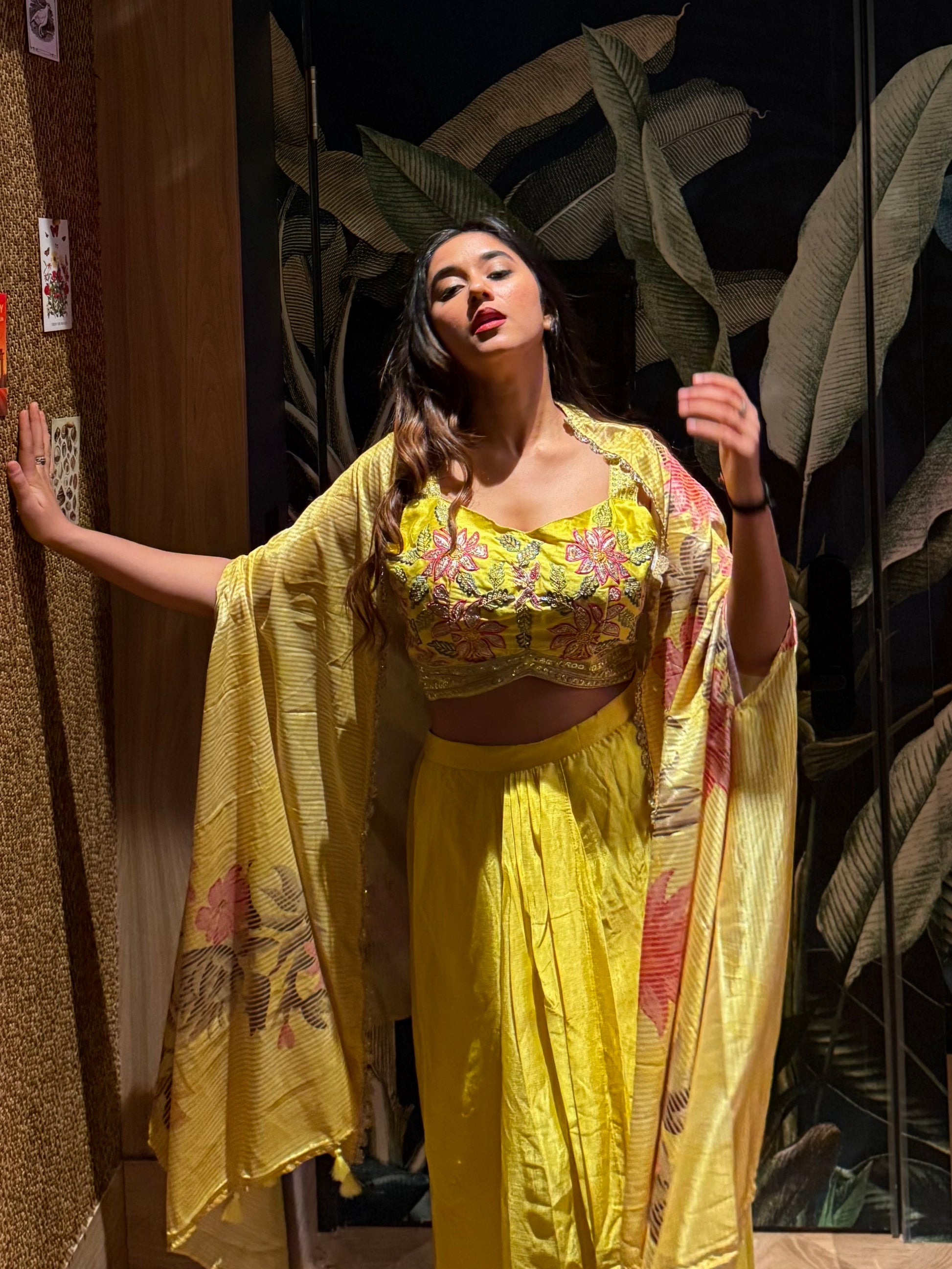 Radiate joy in Arohini, a sunshine-yellow ensemble that captures the essence of celebration. Featuring detailed floral embroidery and mirror accents, this flowy palazzo and cape set is perfect for haldi, mehendi, or festive occasions.