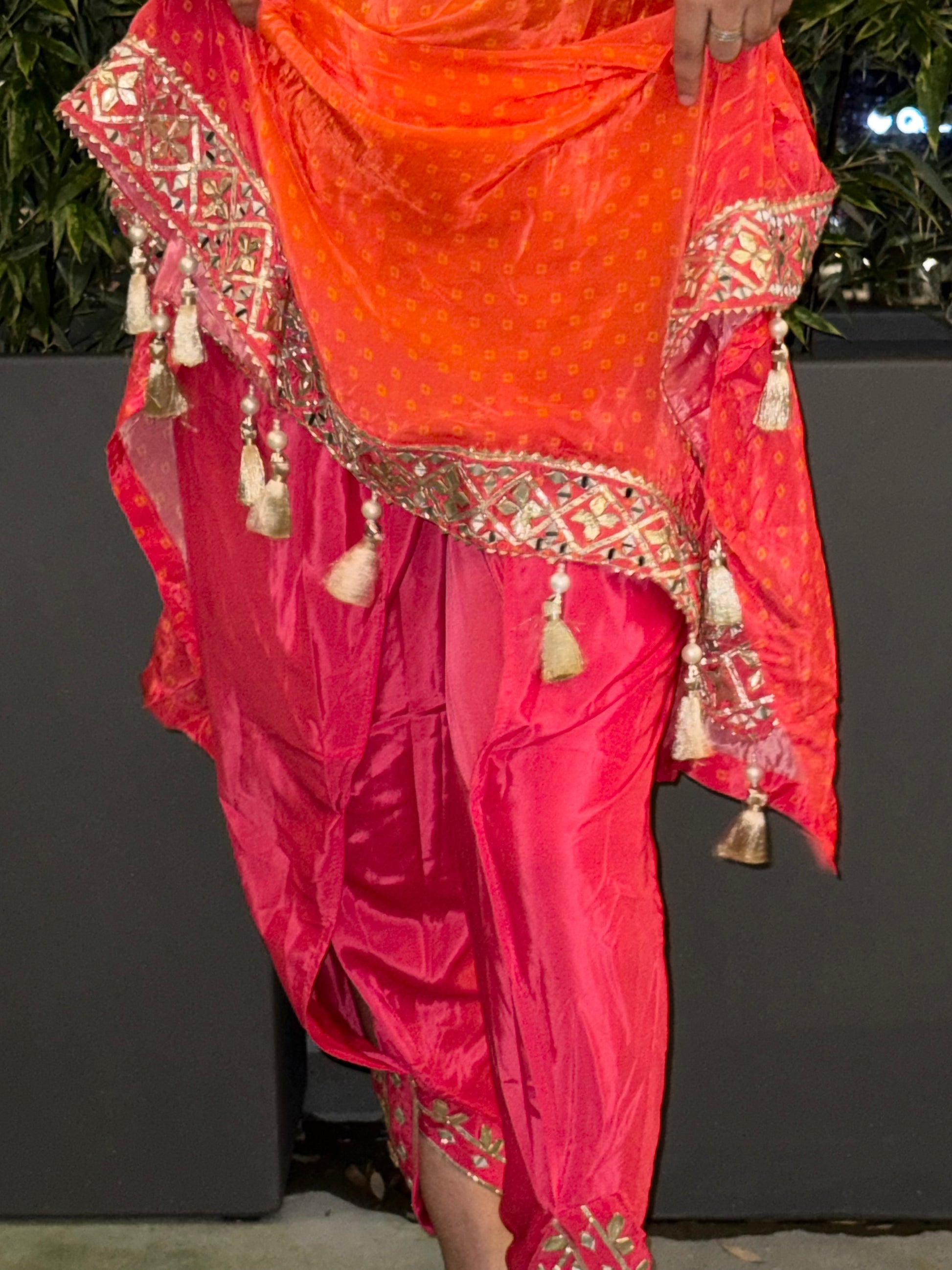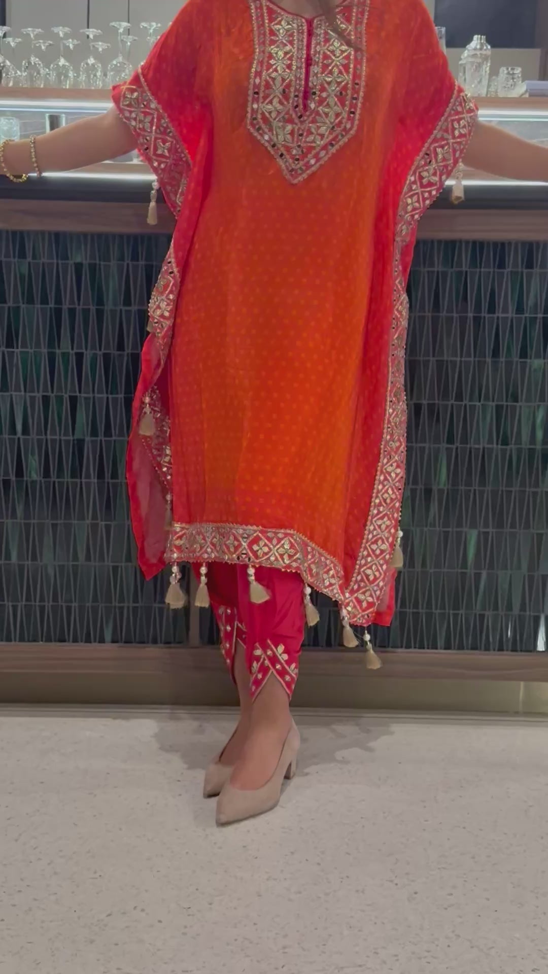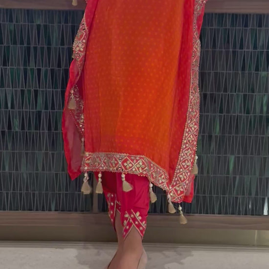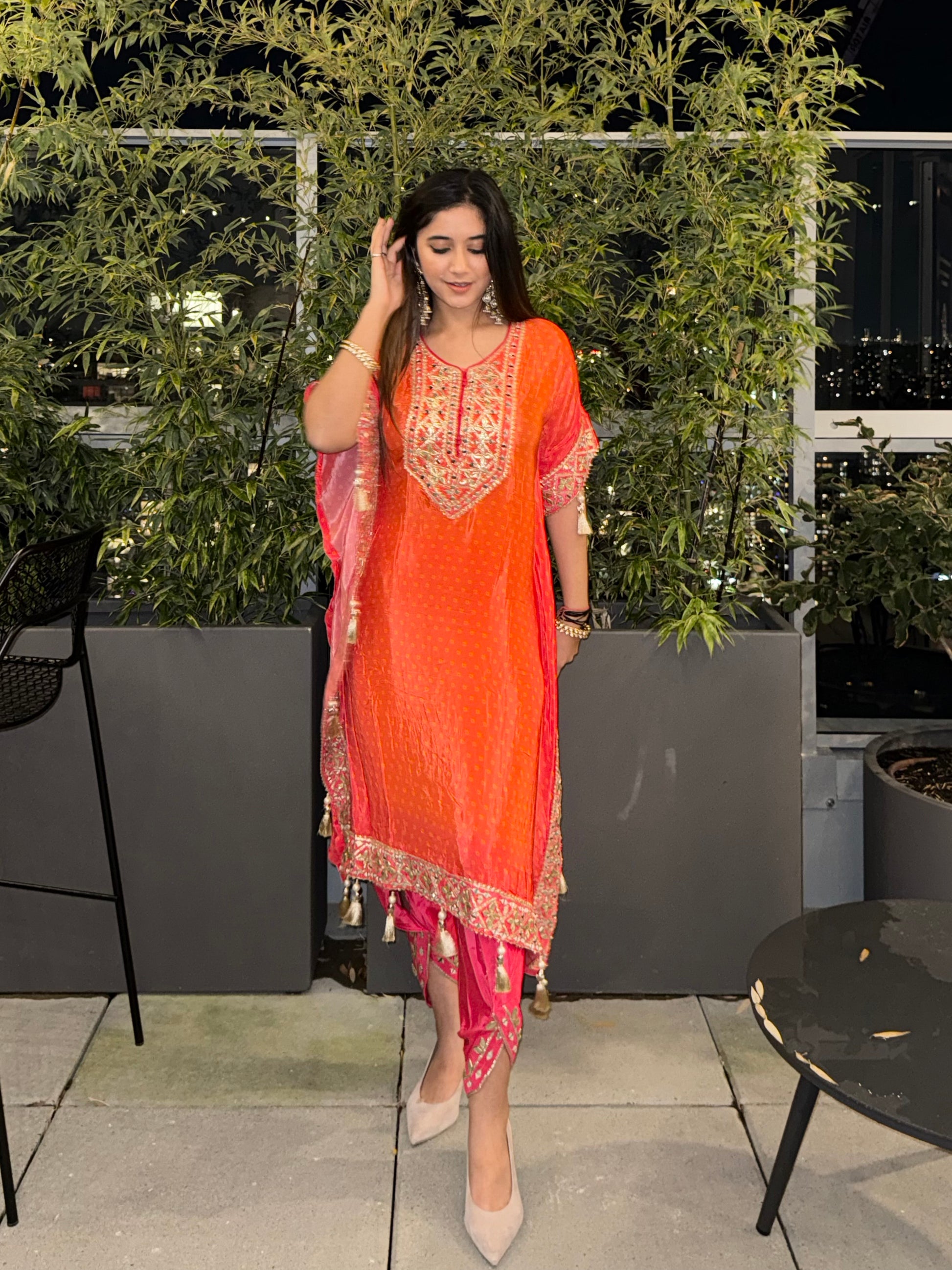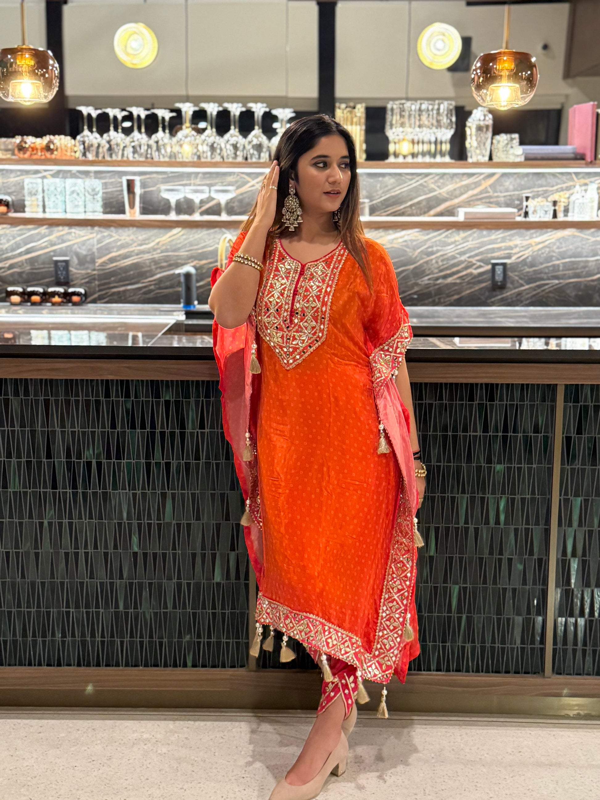 Radiate warmth and festive charm in this vibrant tangerine viscose silk kaftan set, delicately handcrafted for the modern woman who loves a hint of tradition. Made from Viscose Natural Crepe Silk and Simar Organza Silk, this ensemble features hand mirror work and gota patti embellishments throughout. The free-flowing kaftan paired with tulip pants offers both comfort and sophistication — a perfect choice for daytime festivities or evening gatherings.