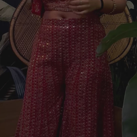 Inayat ; Turn heads with this elegant ruby red co-ord set crafted from real premium georgette. Adorned with full heavy embroidery and Seroski Zarkan work on both the front and back, this outfit exudes rich festive charm. The matching embroidered blouse, palazzo, and jacket create a statement silhouette that blends comfort with couture. Perfect for weddings, festive gatherings, or evening events.