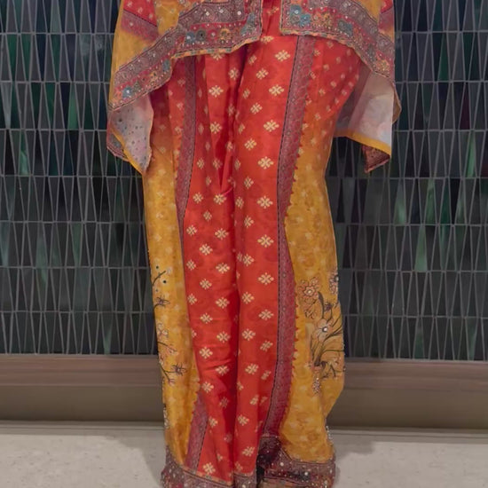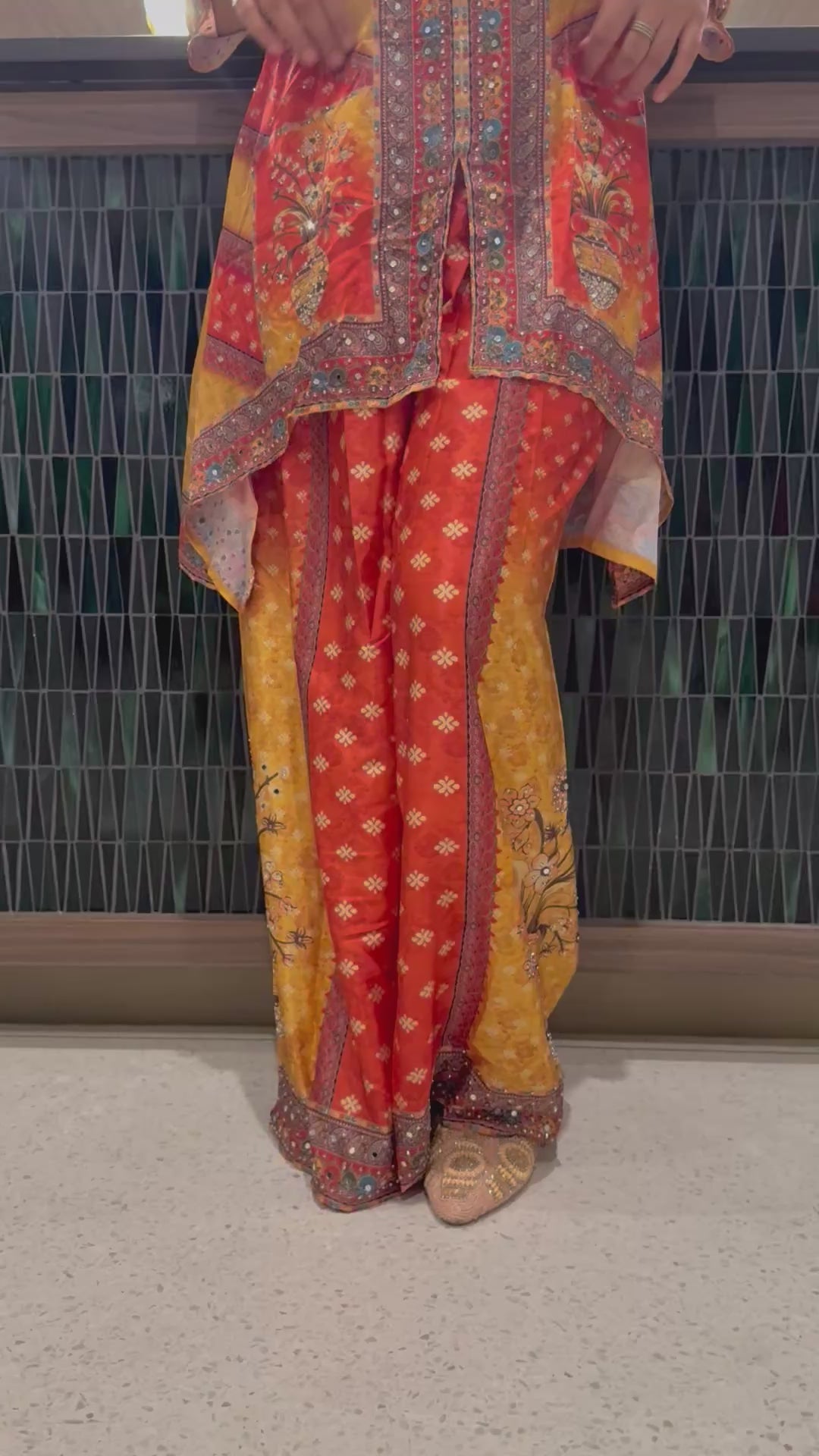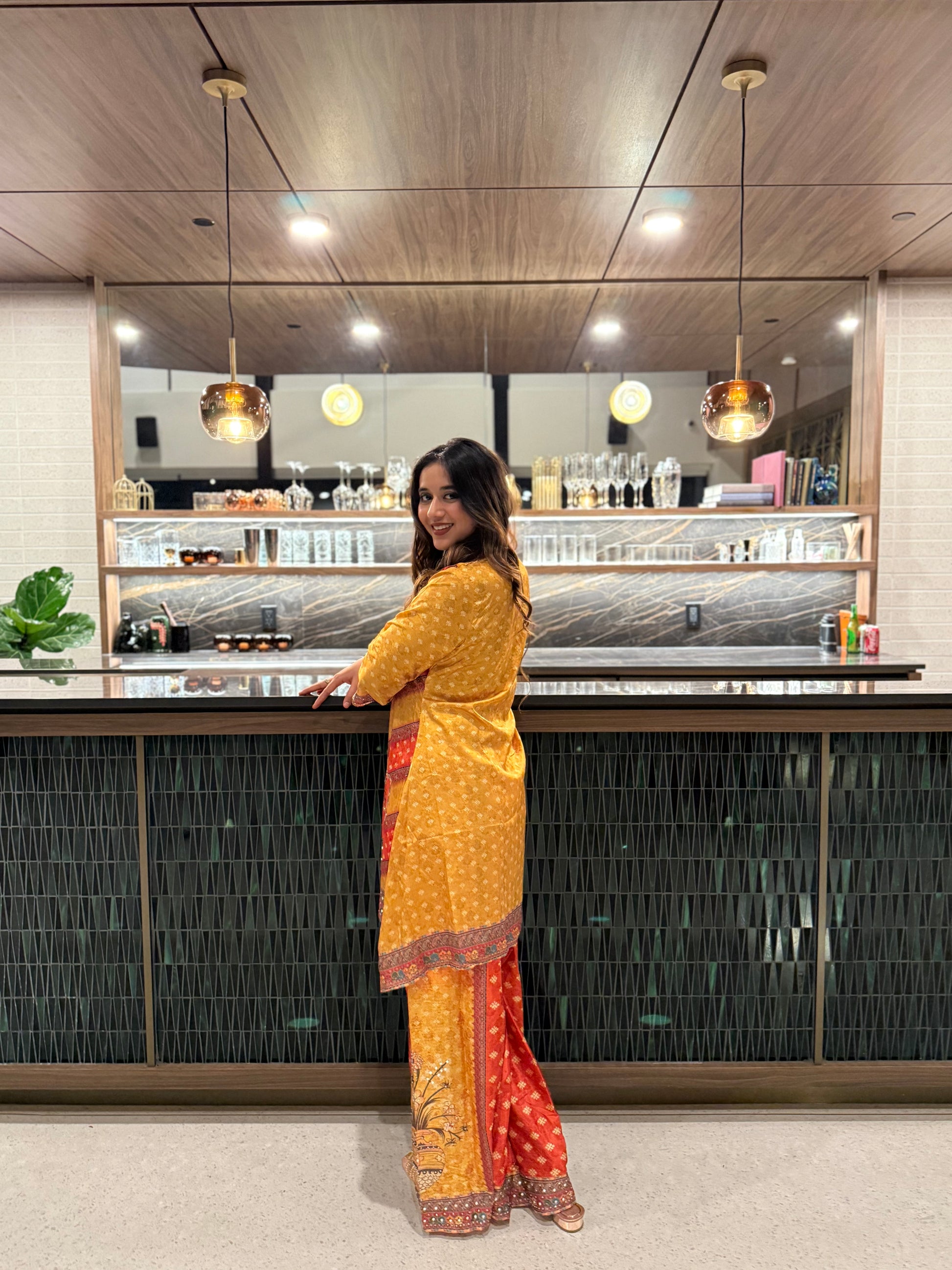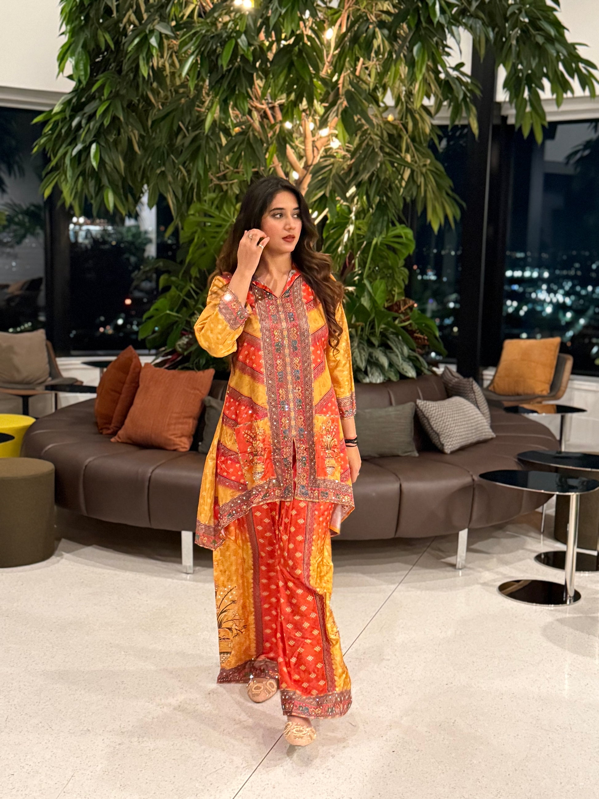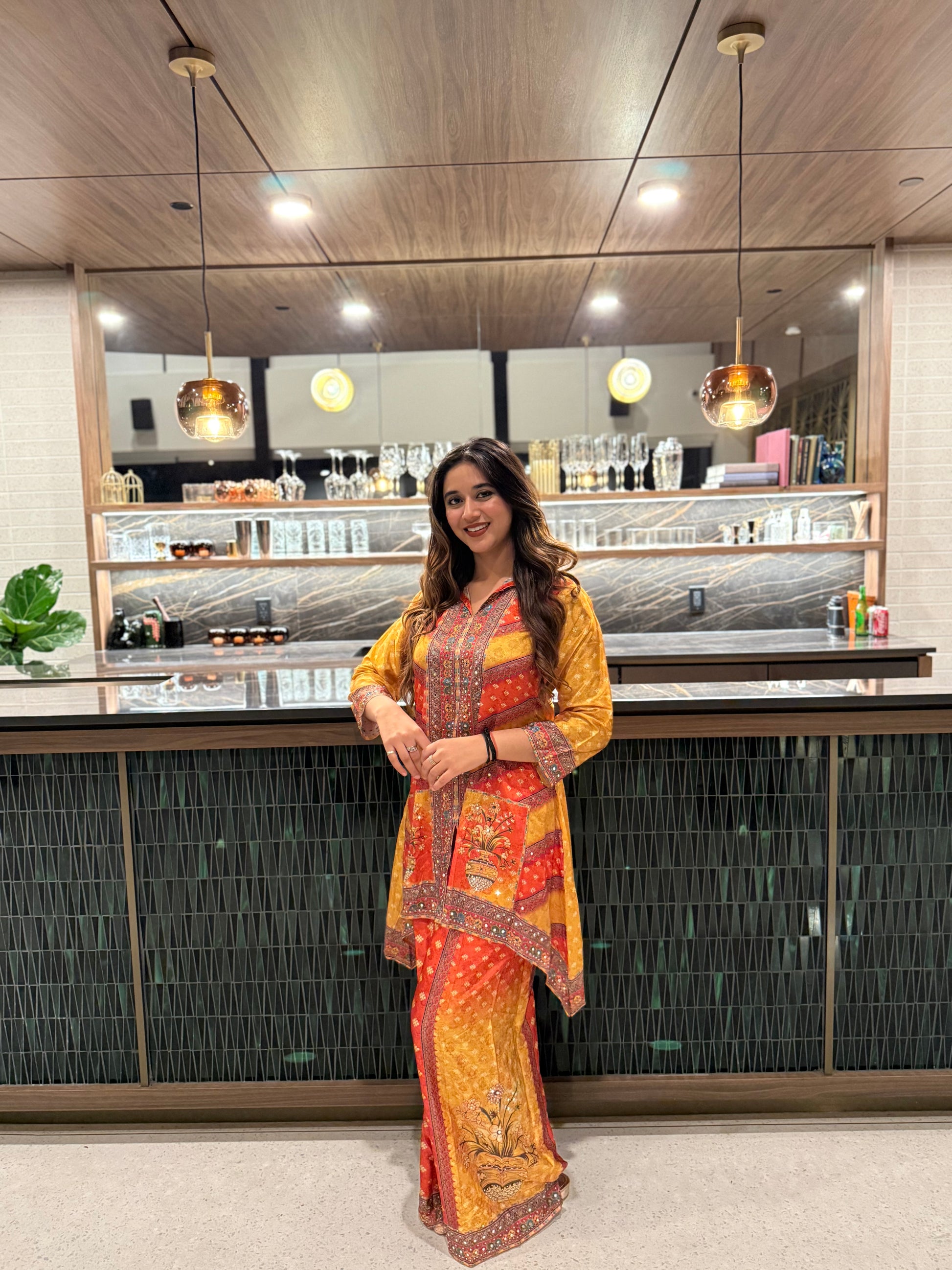 Step into radiant warmth with IRA’s Yellow & Red Crepe Silk Co-ord Set. This MIrror Work ensemble blends vibrant hues with detailed craftsmanship for a truly festive statement. Made from Real Premium Crepe Silk, it offers luxurious comfort with timeless elegance — ideal for festive brunches, mehendi functions, or cultural evenings.