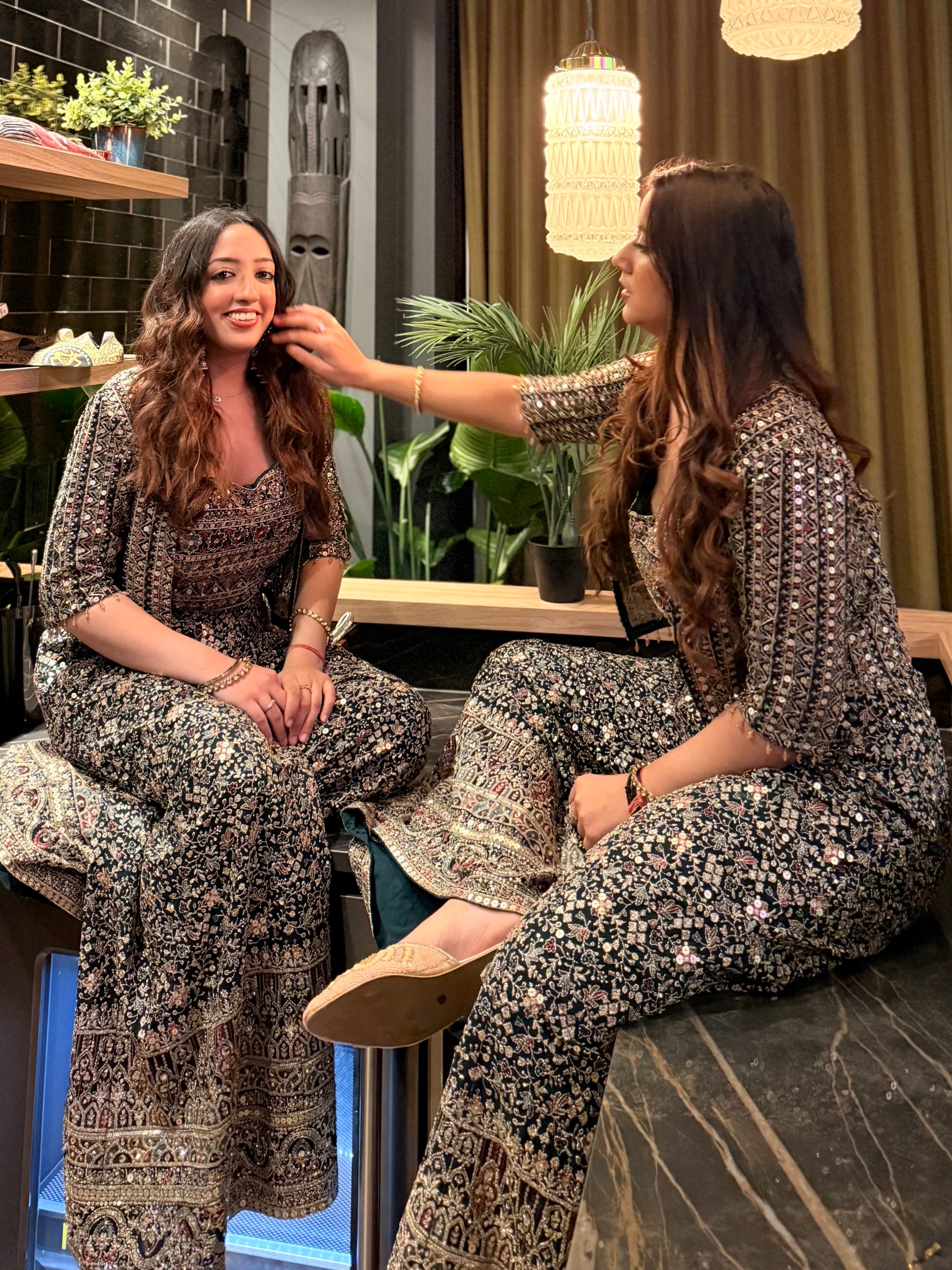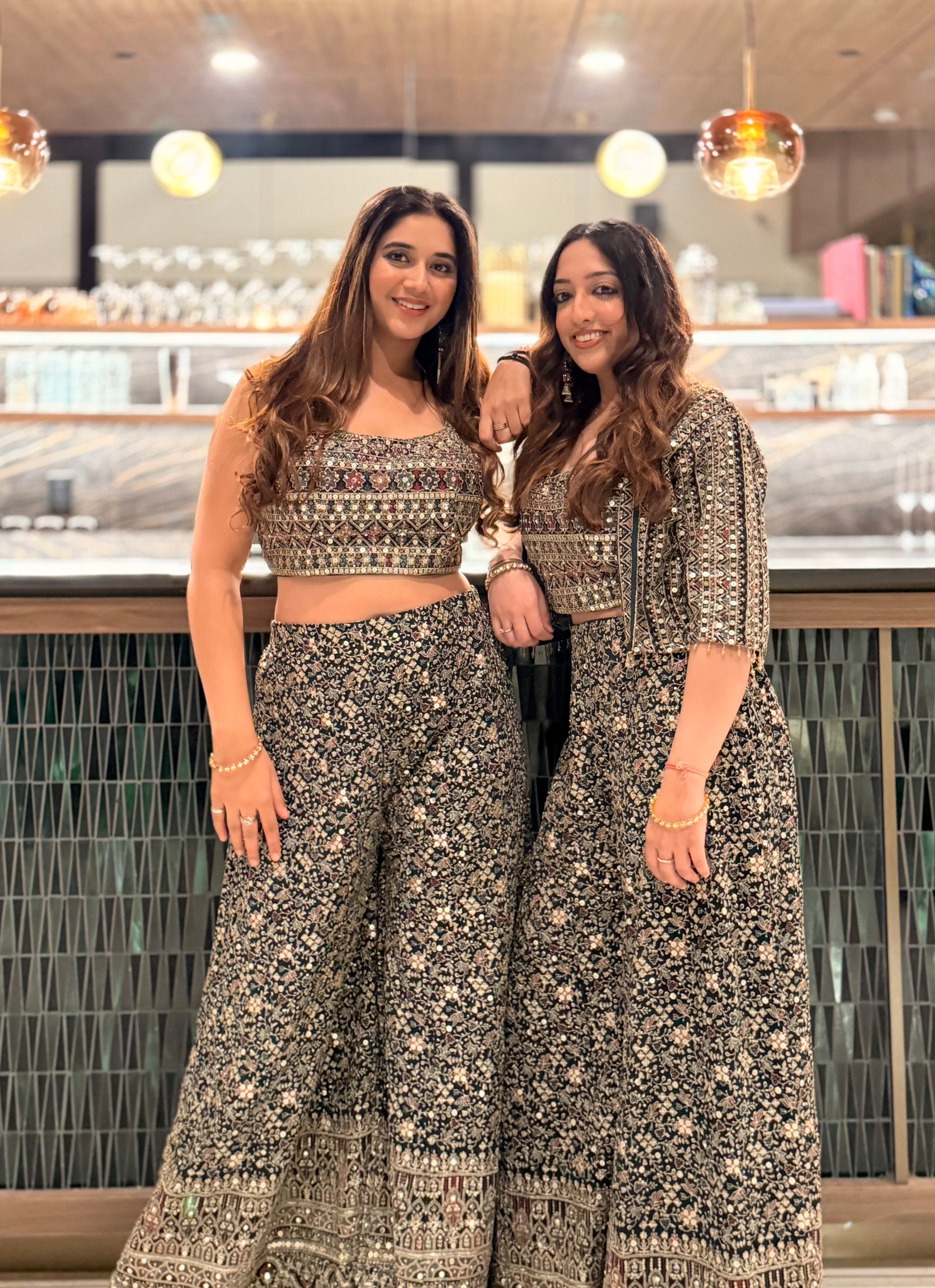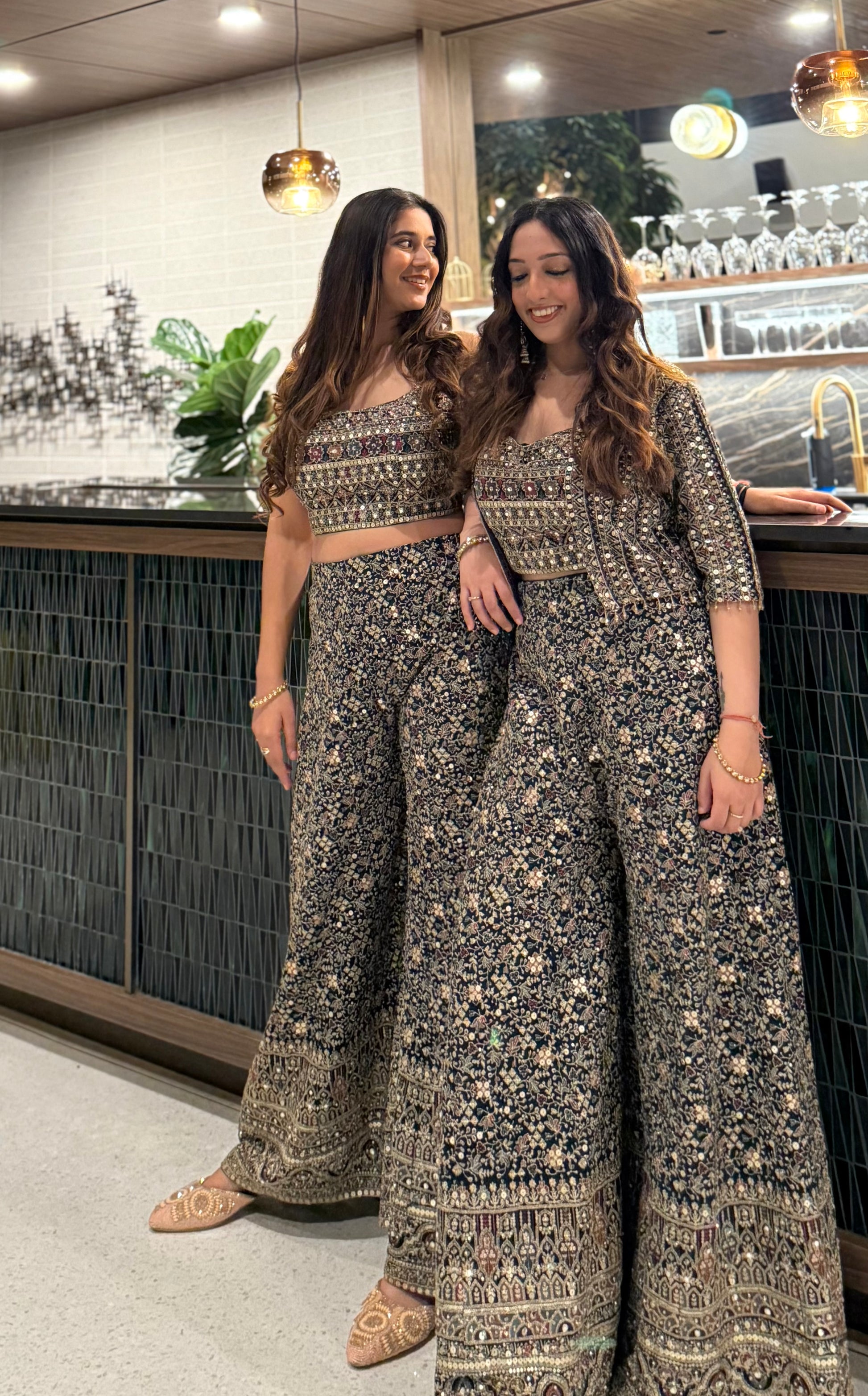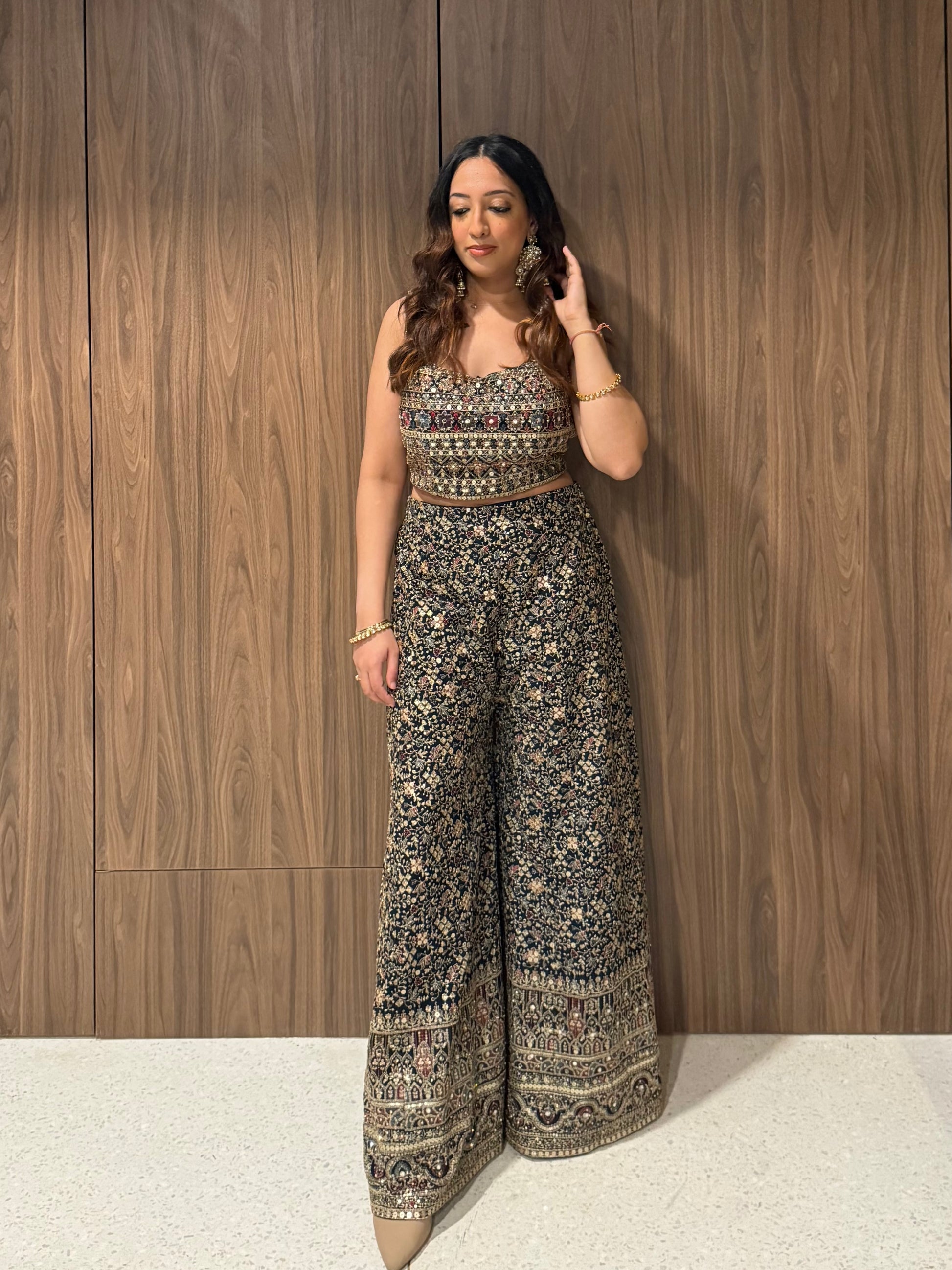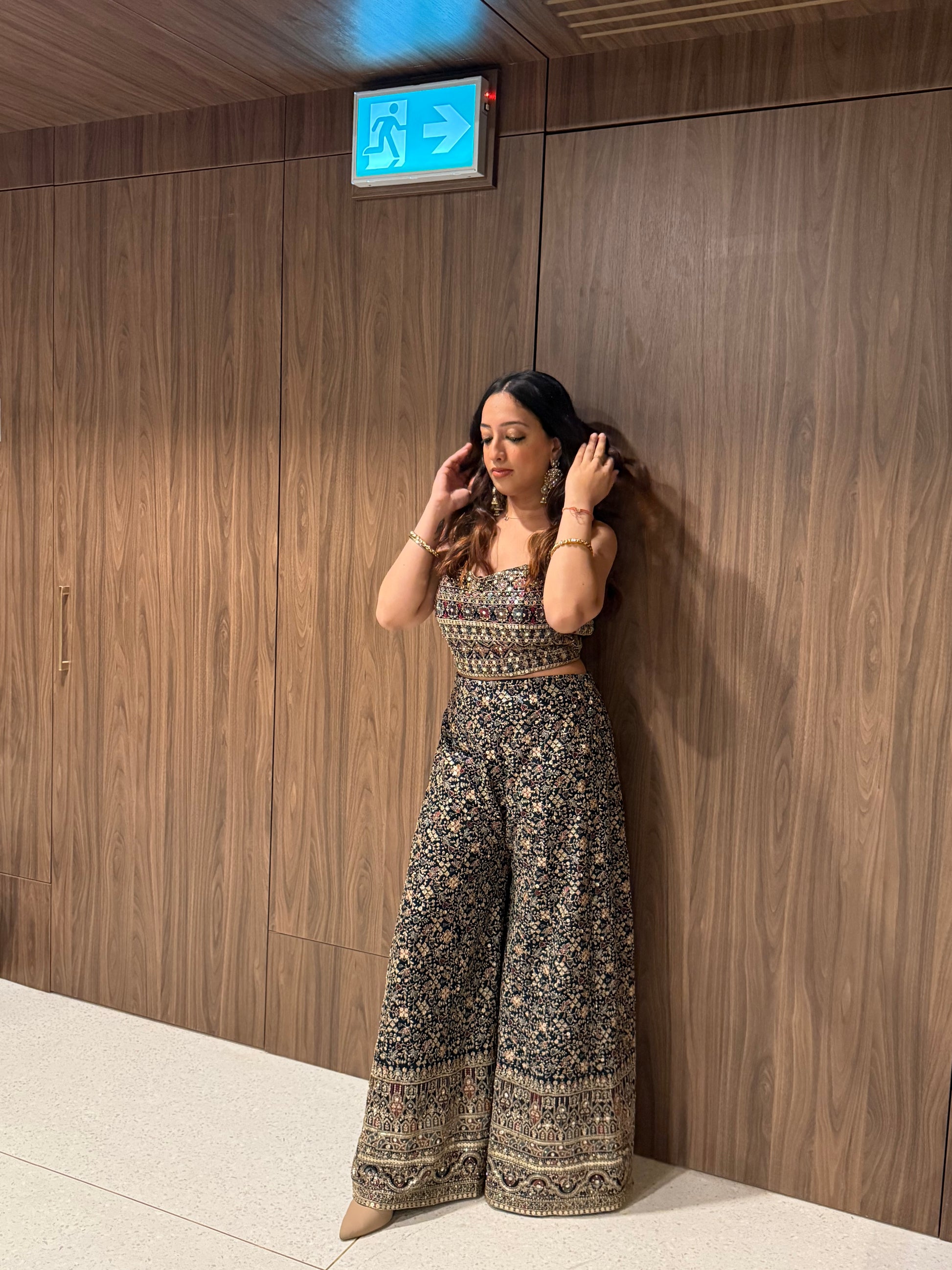 This green and gold embroidered georgette co-ord set redefines modern ethnic luxury. Featuring exquisite Zarkan and thread embroidery across the blouse, palazzo, and jacket, the design combines traditional artistry with a contemporary cut. Lightweight yet opulent, it’s the perfect pick for evening functions or intimate festive gatherings.