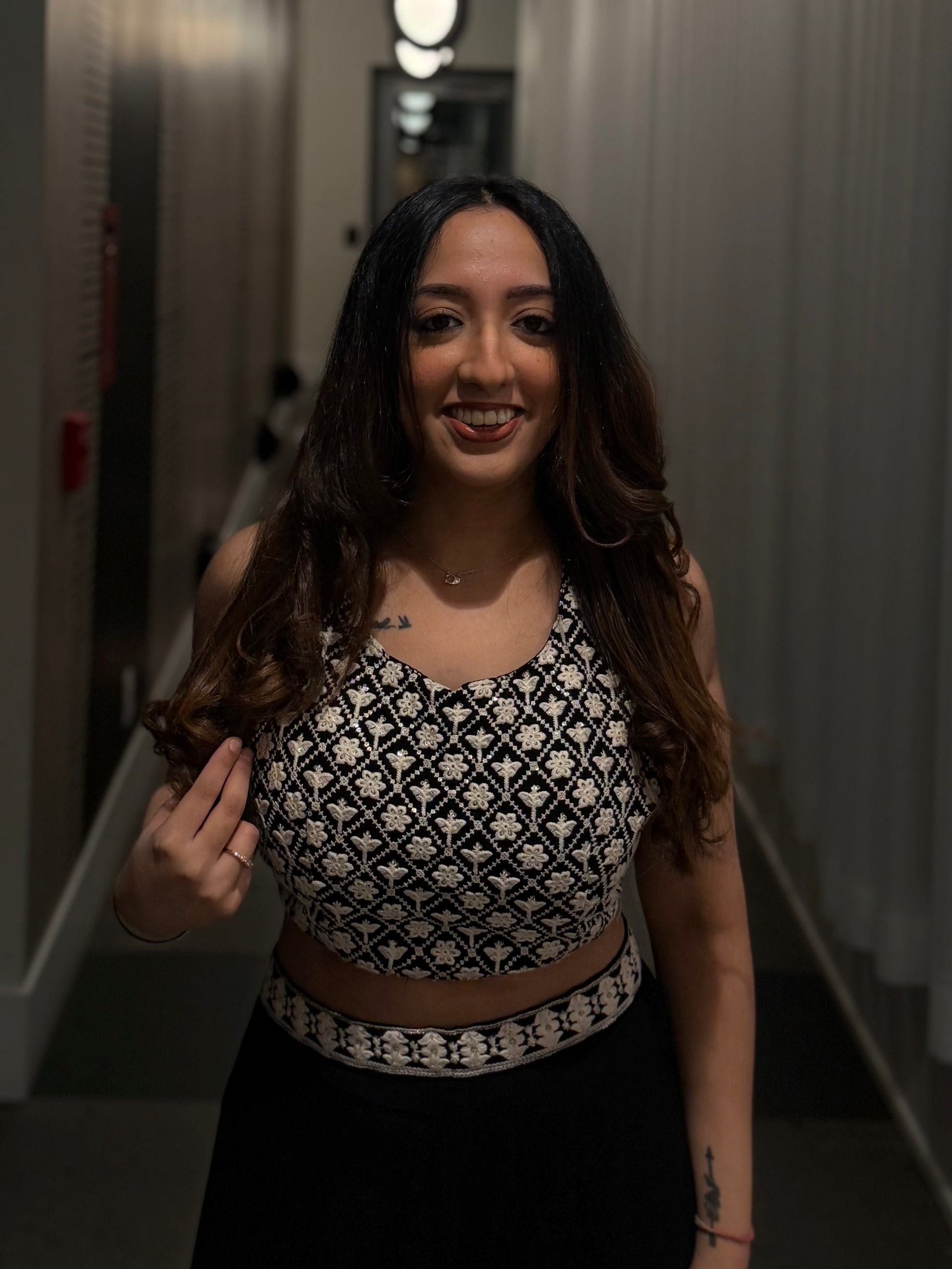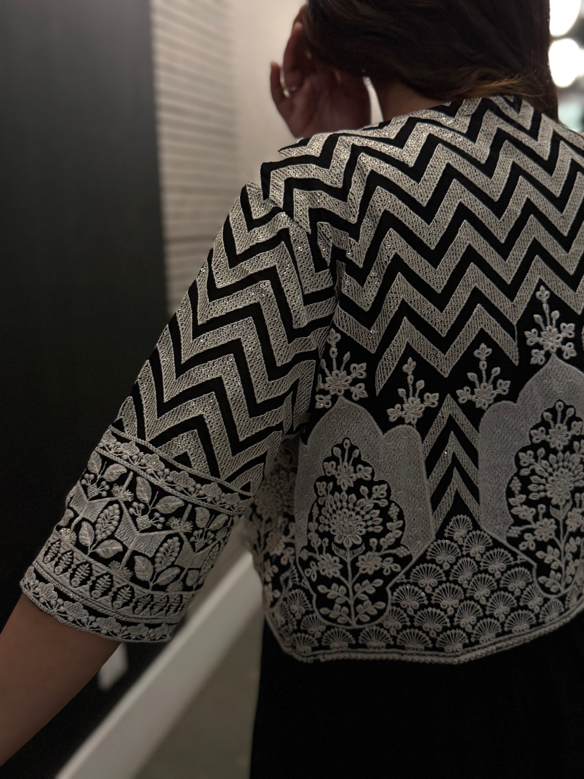 Timeless and bold, Noor redefines classic elegance. Crafted in rich black chinon silk, this ensemble features a hand-embroidered mirror-work blouse paired with a flowing palazzo and a heavy embroidered georgette jacket.