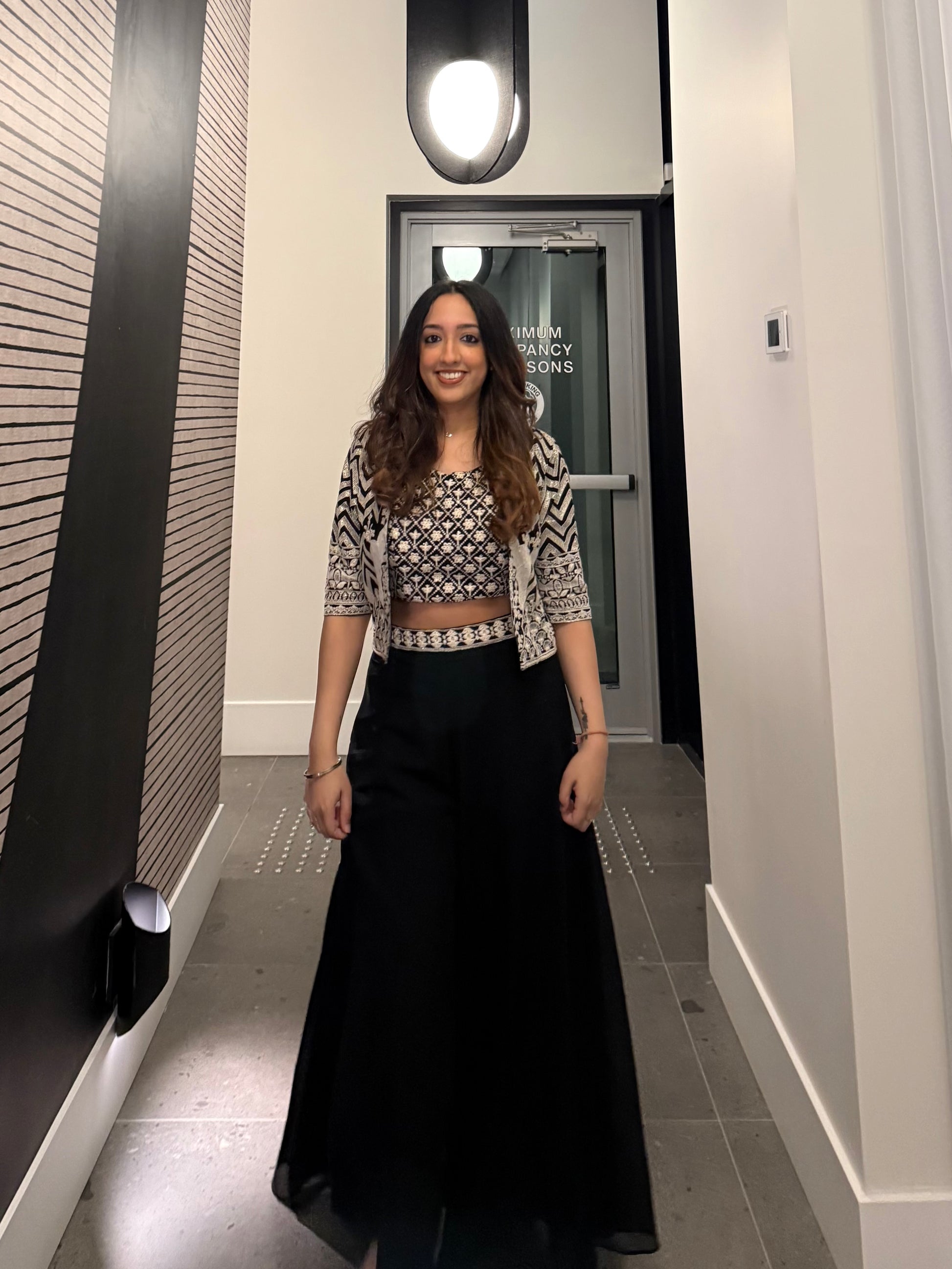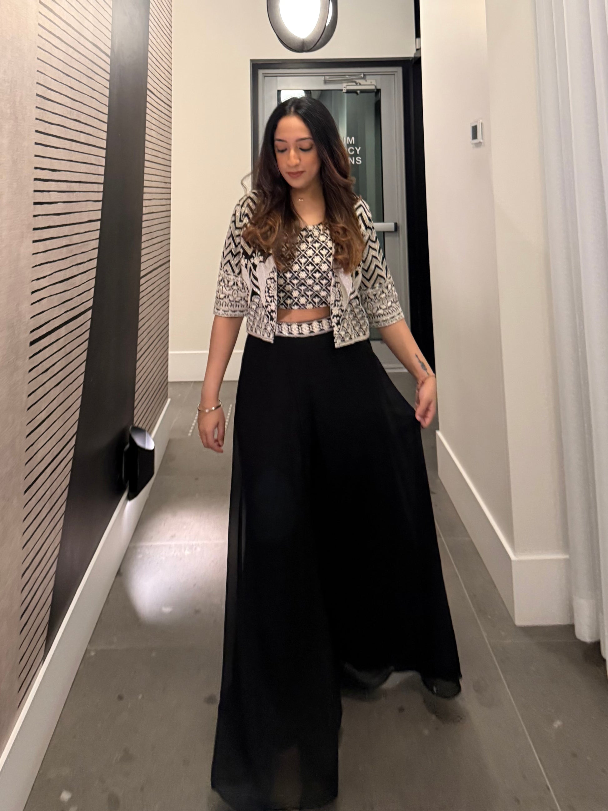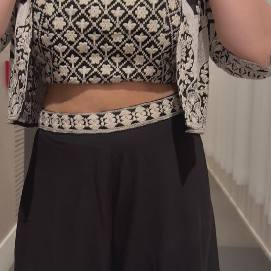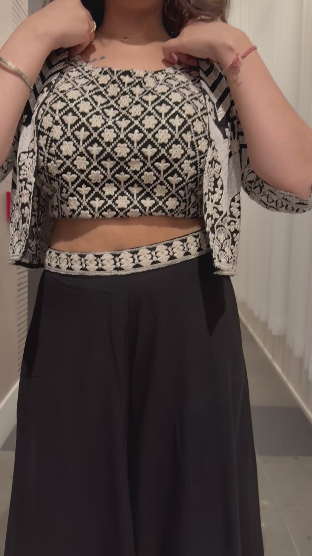 Keywords: black palazzo set, mirror work blouse, embroidered jacket set, designer Indian wear, festive ethnic outfit