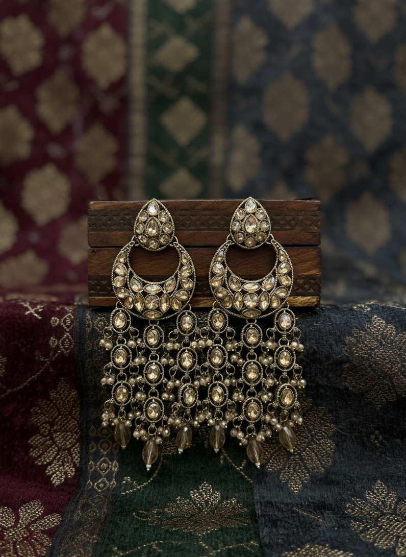 The Noor Chandelier Earrings are a vision of refined opulence, designed to illuminate every occasion. Featuring a statement circular motif adorned with intricate stone detailing, these earrings cascade into delicate tiers that shimmer with movement and light.