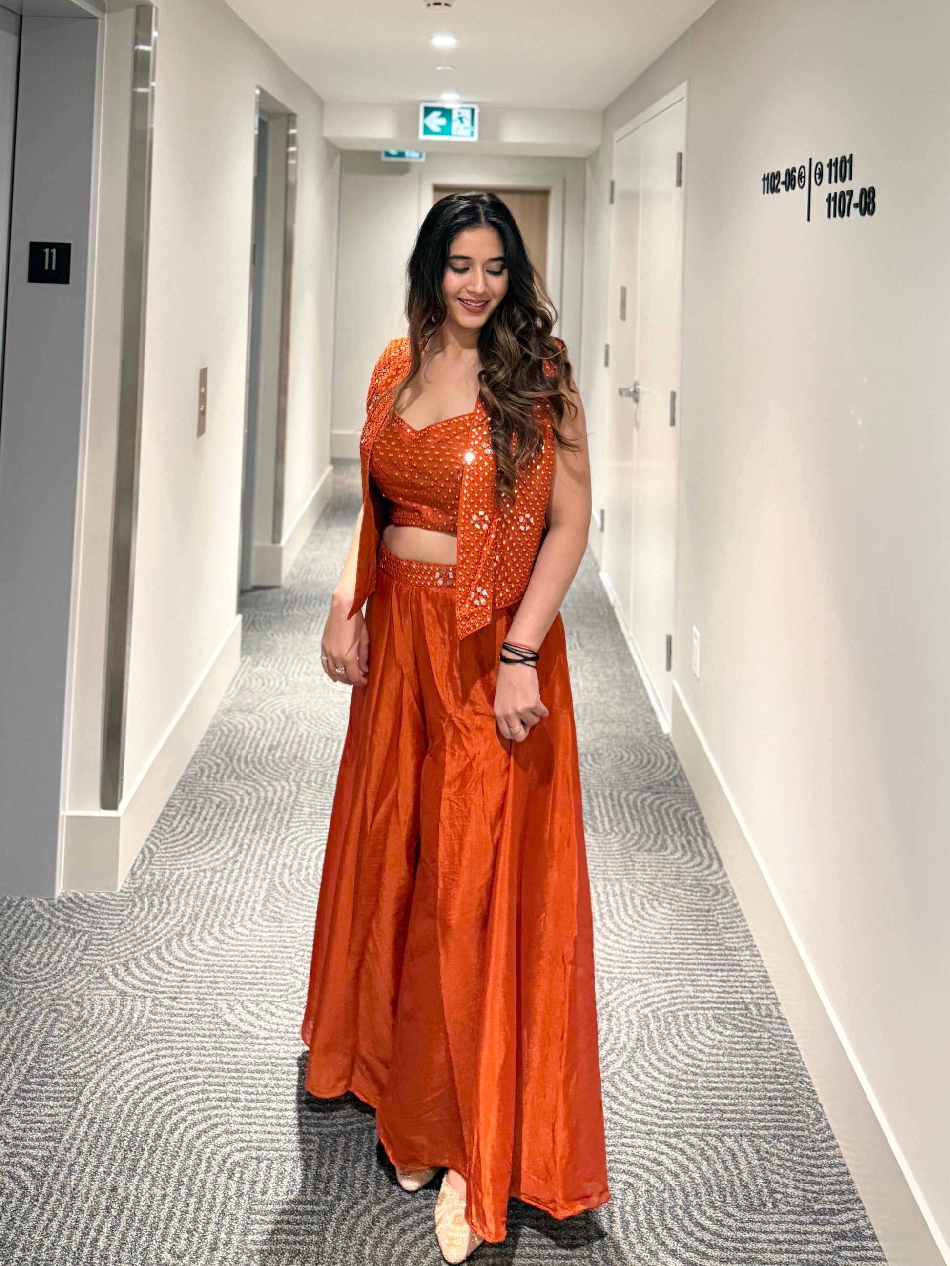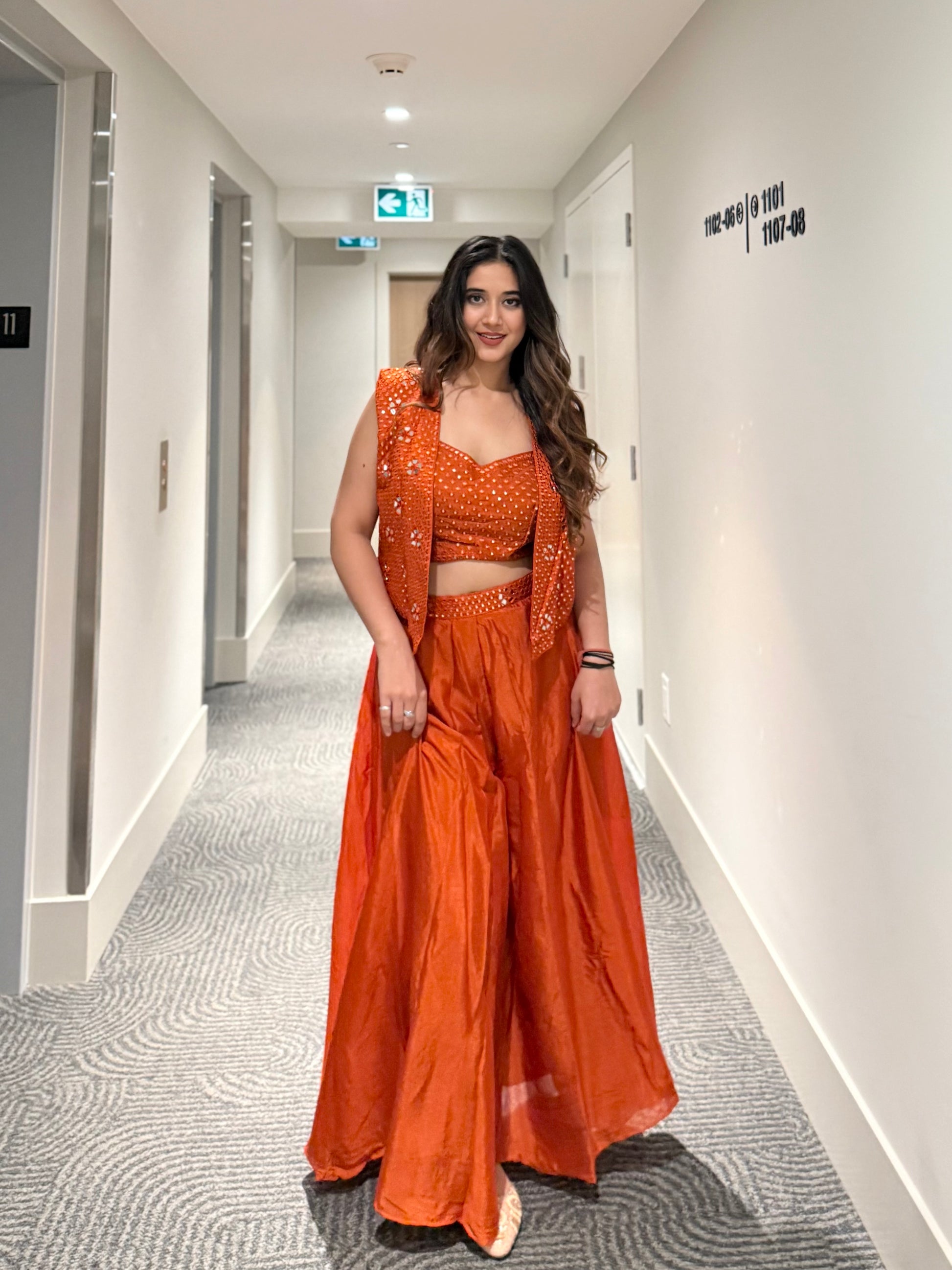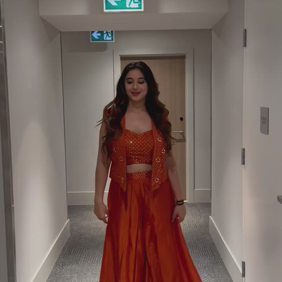 Infused with warmth and luxury, Kesar Vyom radiates confidence and charm. The rust-orange hue, detailed mirror embroidery, and flowy chinon silk silhouette create a regal yet effortless look. The structured embroidered jacket enhances its festive appeal, making it a standout choice for weddings or cultural events.