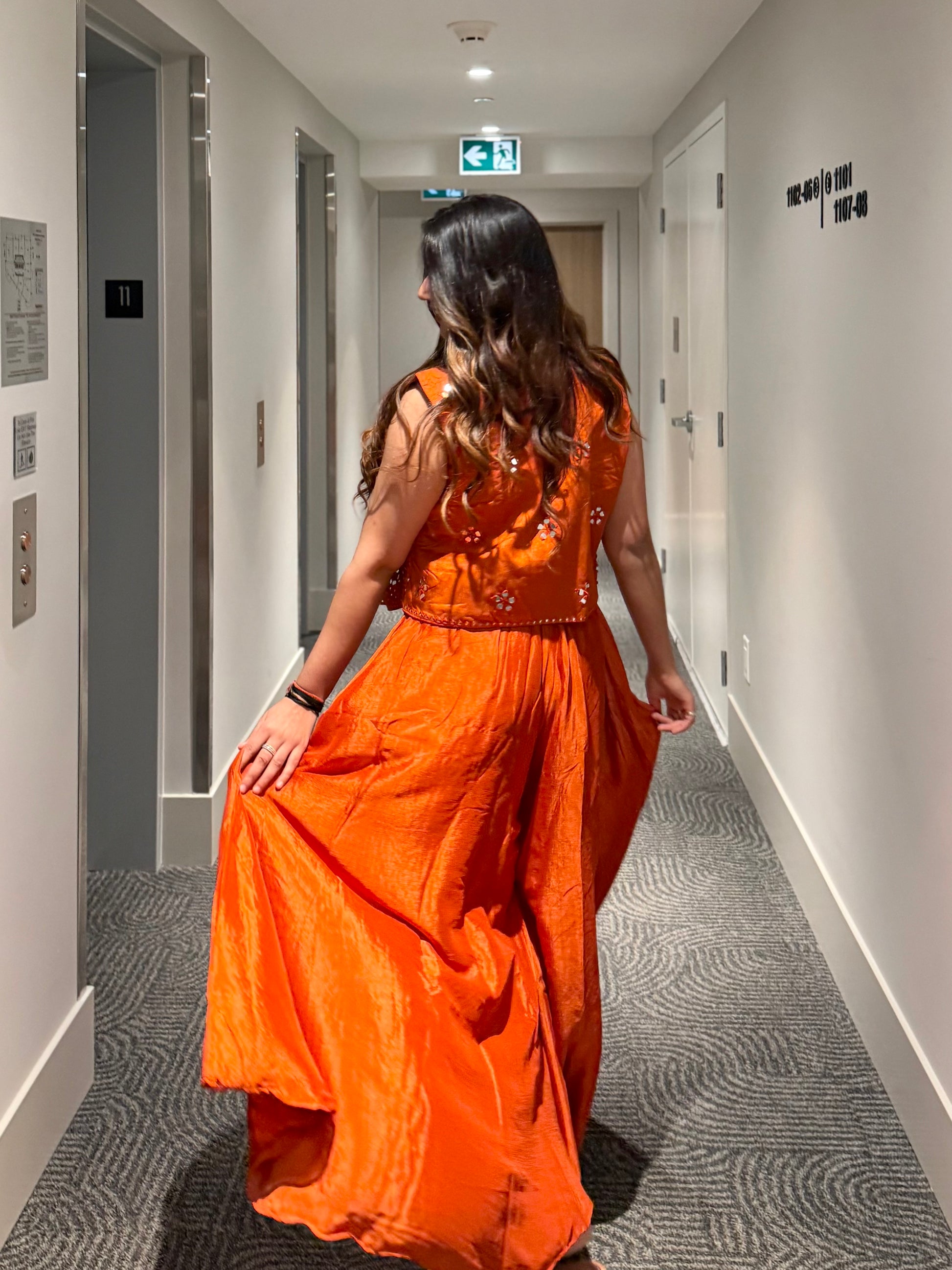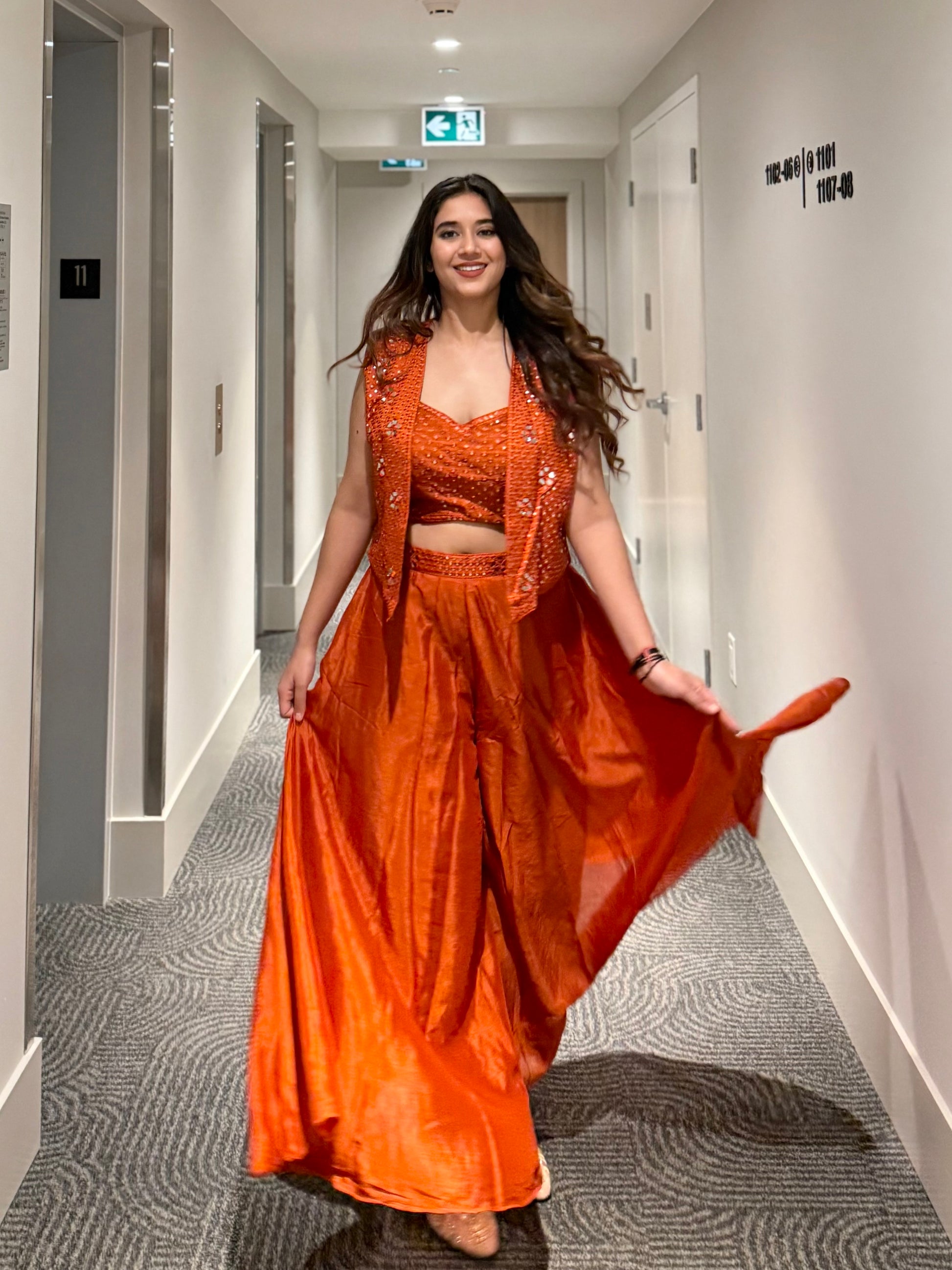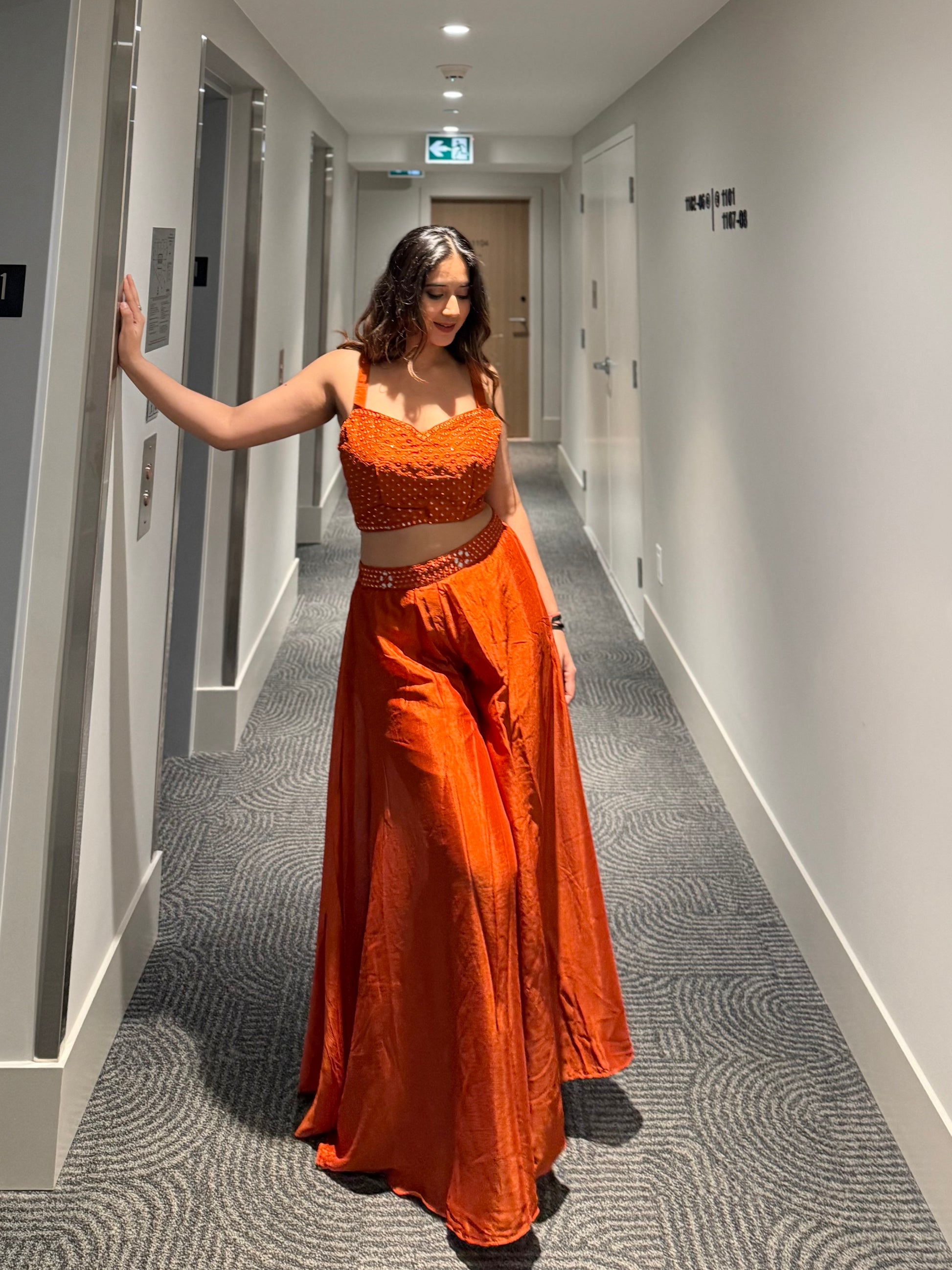 Infused with warmth and luxury, Kesar Vyom radiates confidence and charm. The rust-orange hue, detailed mirror embroidery, and flowy chinon silk silhouette create a regal yet effortless look. The structured embroidered jacket enhances its festive appeal, making it a standout choice for weddings or cultural events.