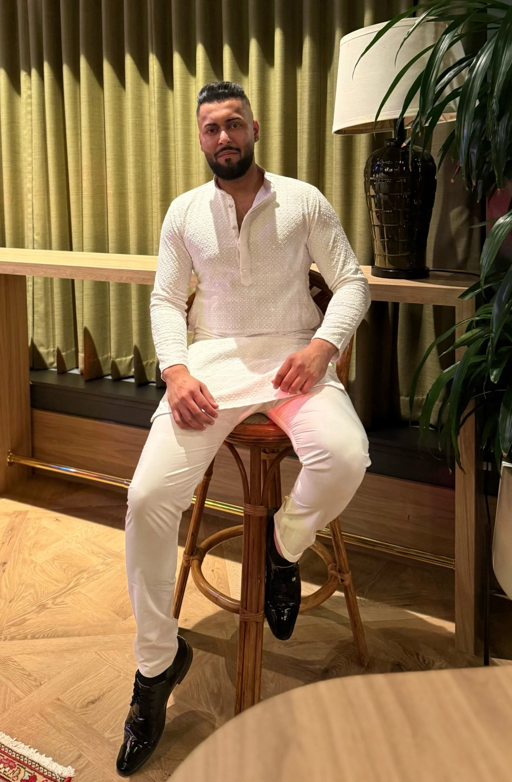 Elevate your ethnic style with this Handcrafted Chikan Work Men’s Kurta Pajama Set, inspired by the timeless artistry of Lucknowi embroidery. Made from premium cloth, this kurta offers unmatched comfort and breathability, perfect for festive occasions, weddings, and cultural celebrations.