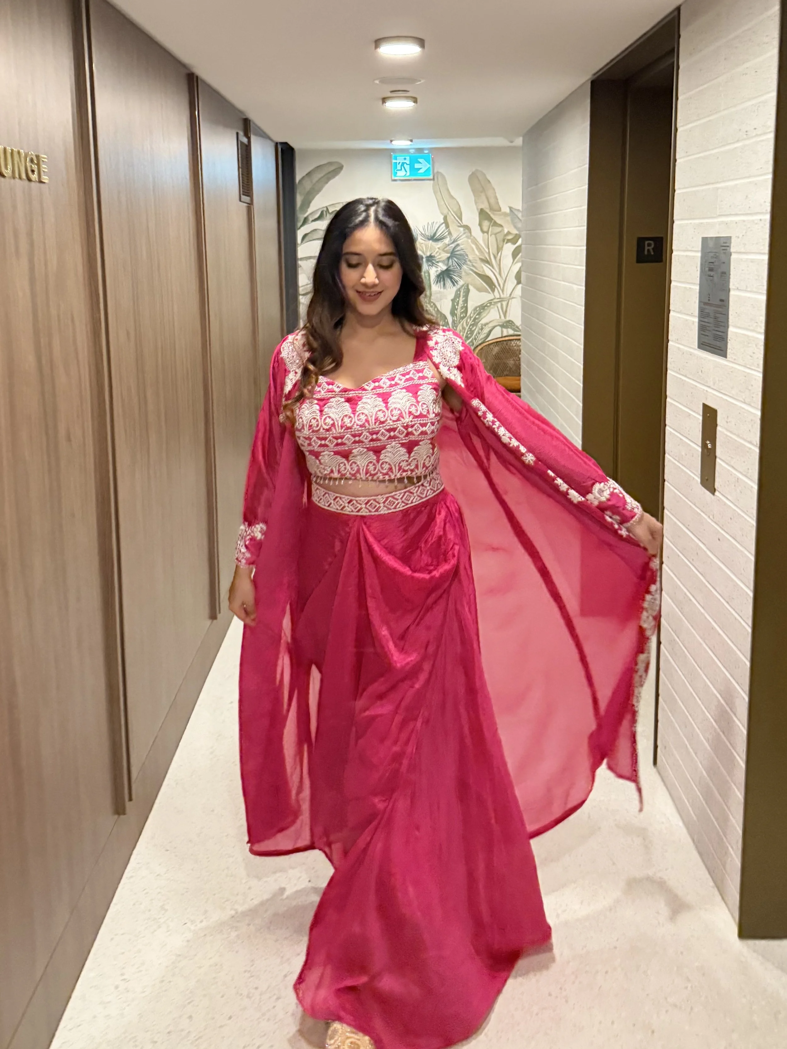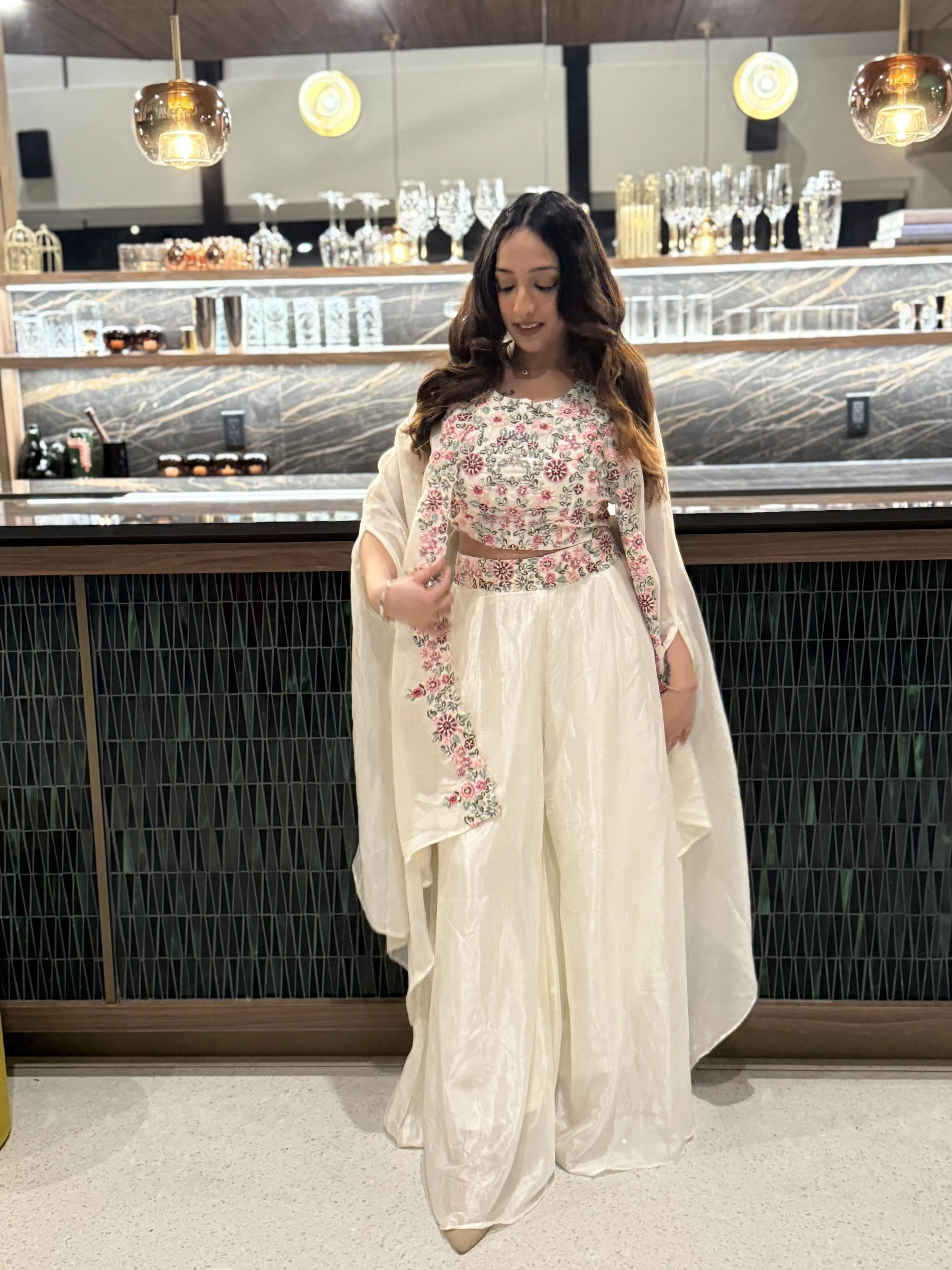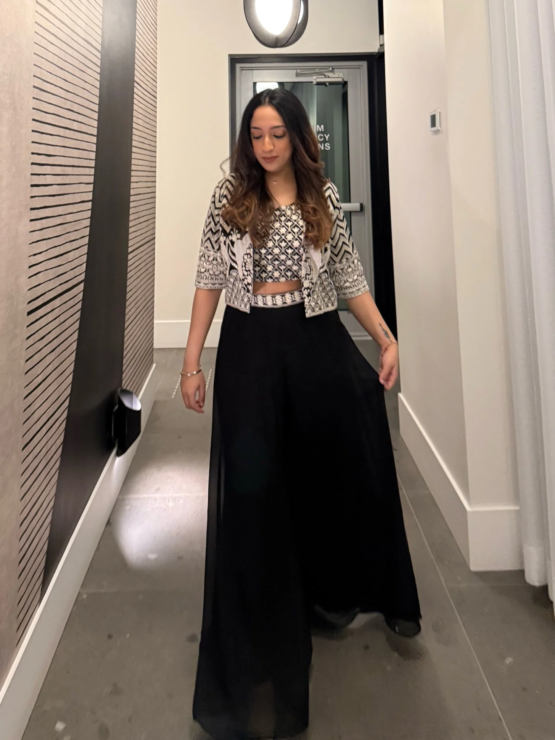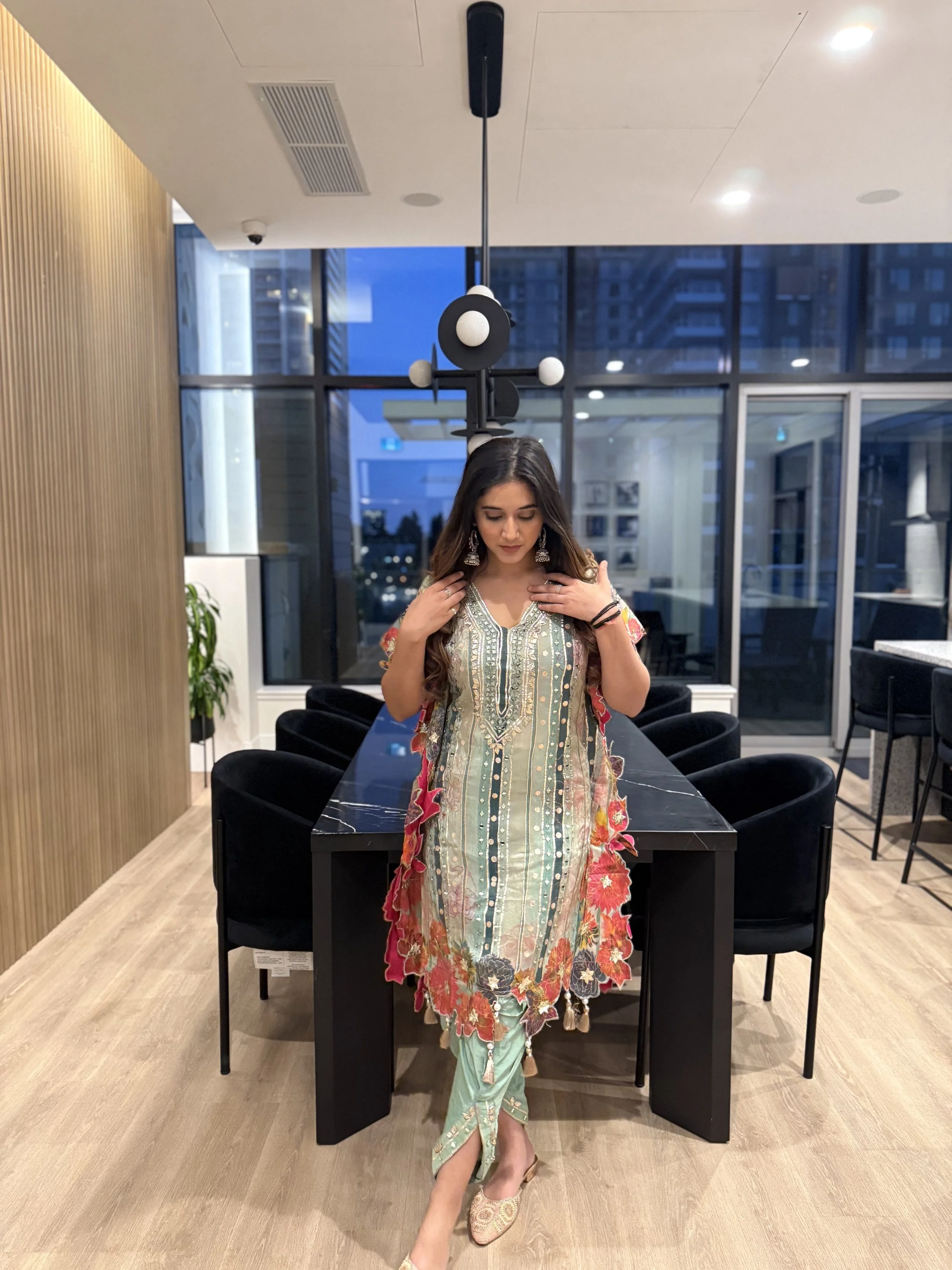 This green and gold embroidered georgette co-ord set redefines modern ethnic luxury. Featuring exquisite Zarkan and thread embroidery across the blouse, palazzo, and jacket, the design combines traditional artistry with a contemporary cut. Lightweight yet opulent, it’s the perfect pick for evening functions or intimate festive gatherings.