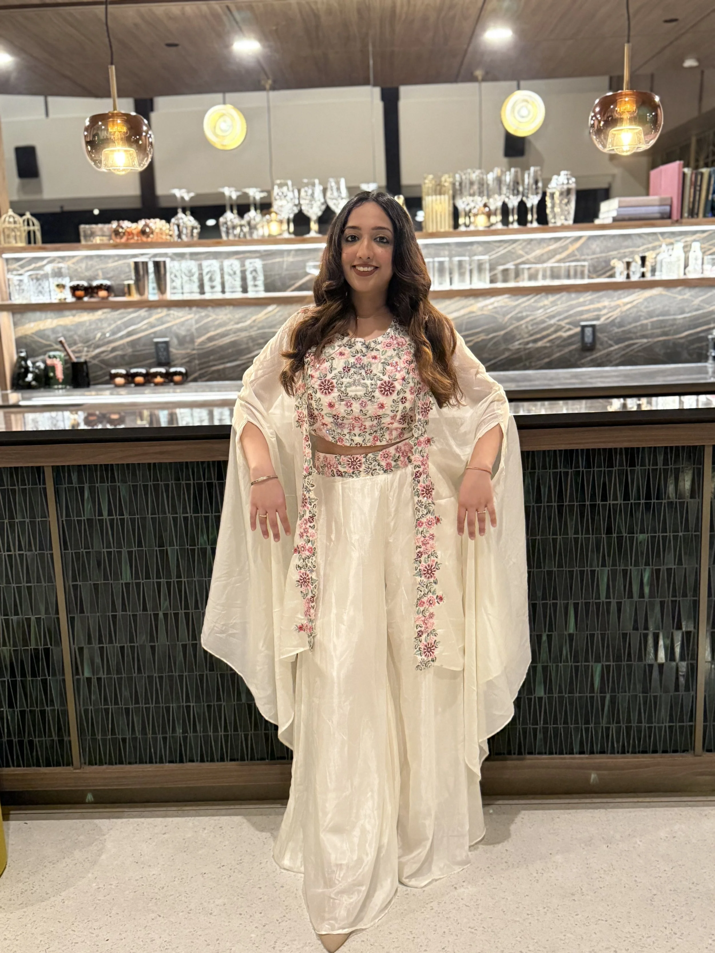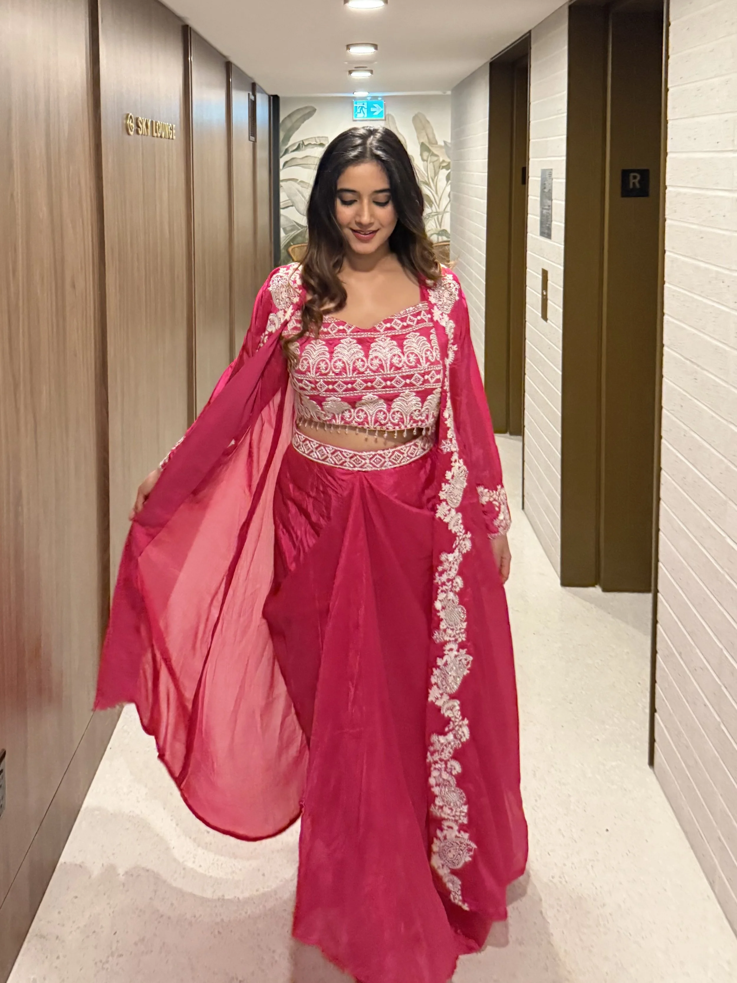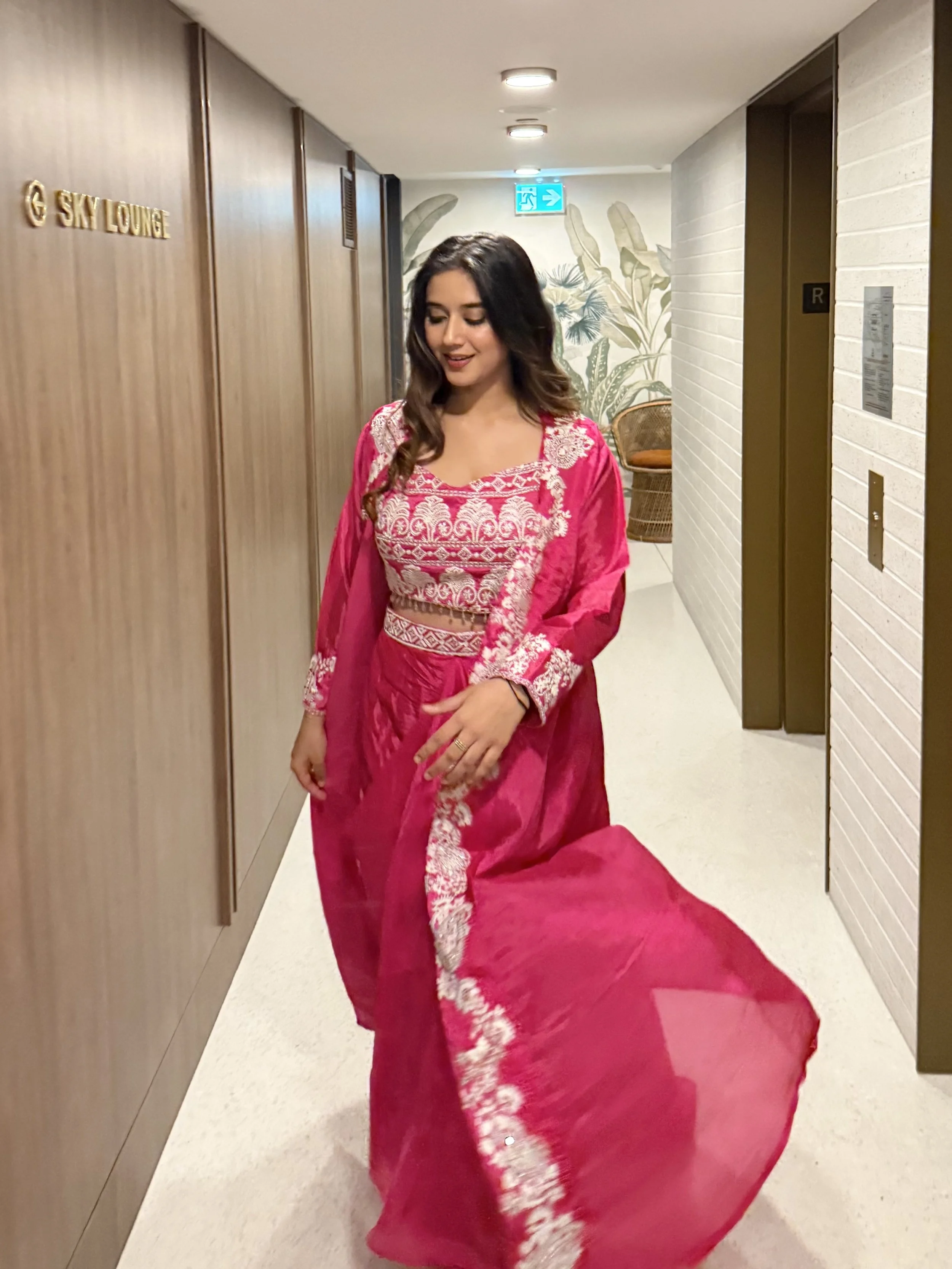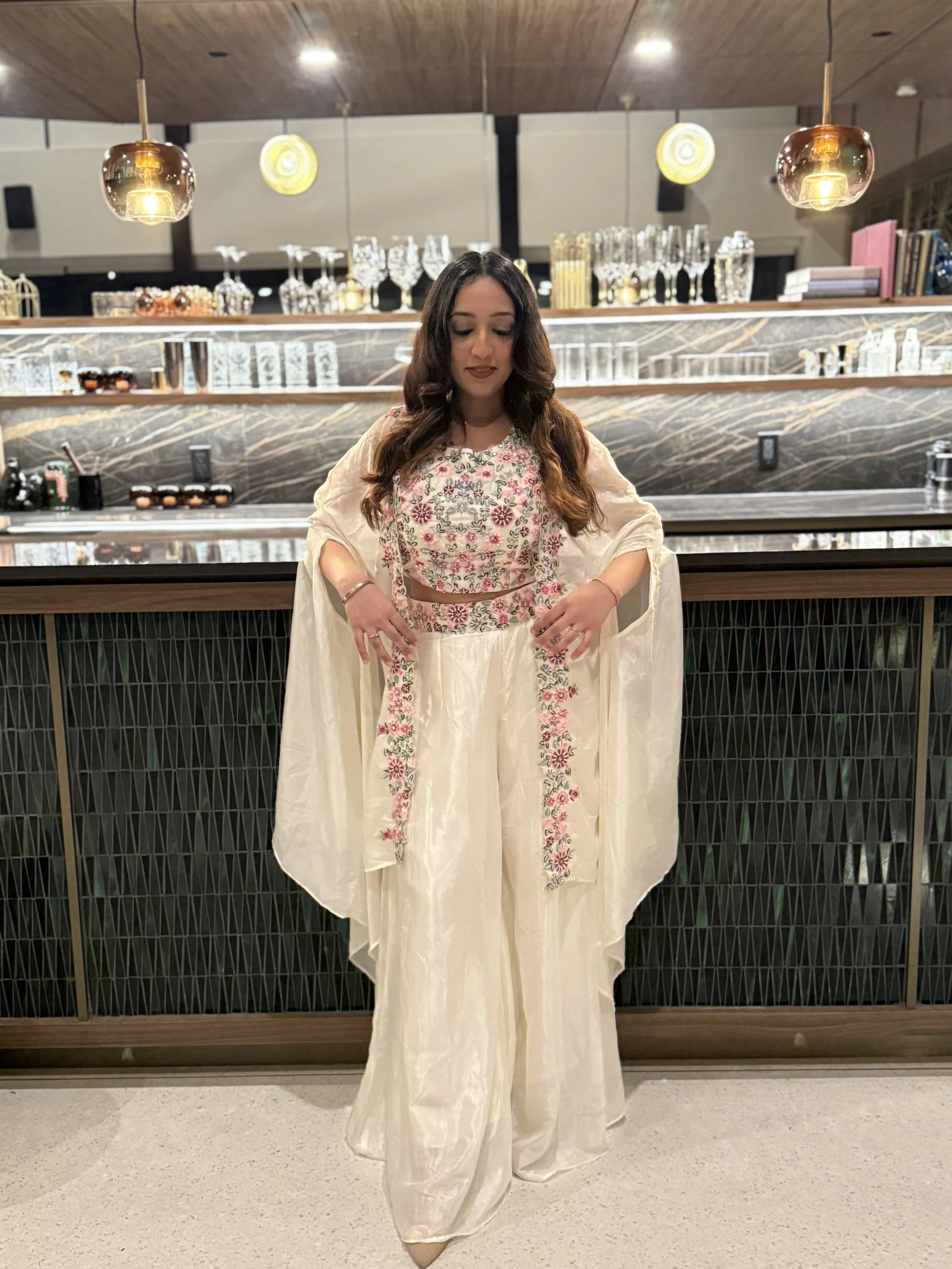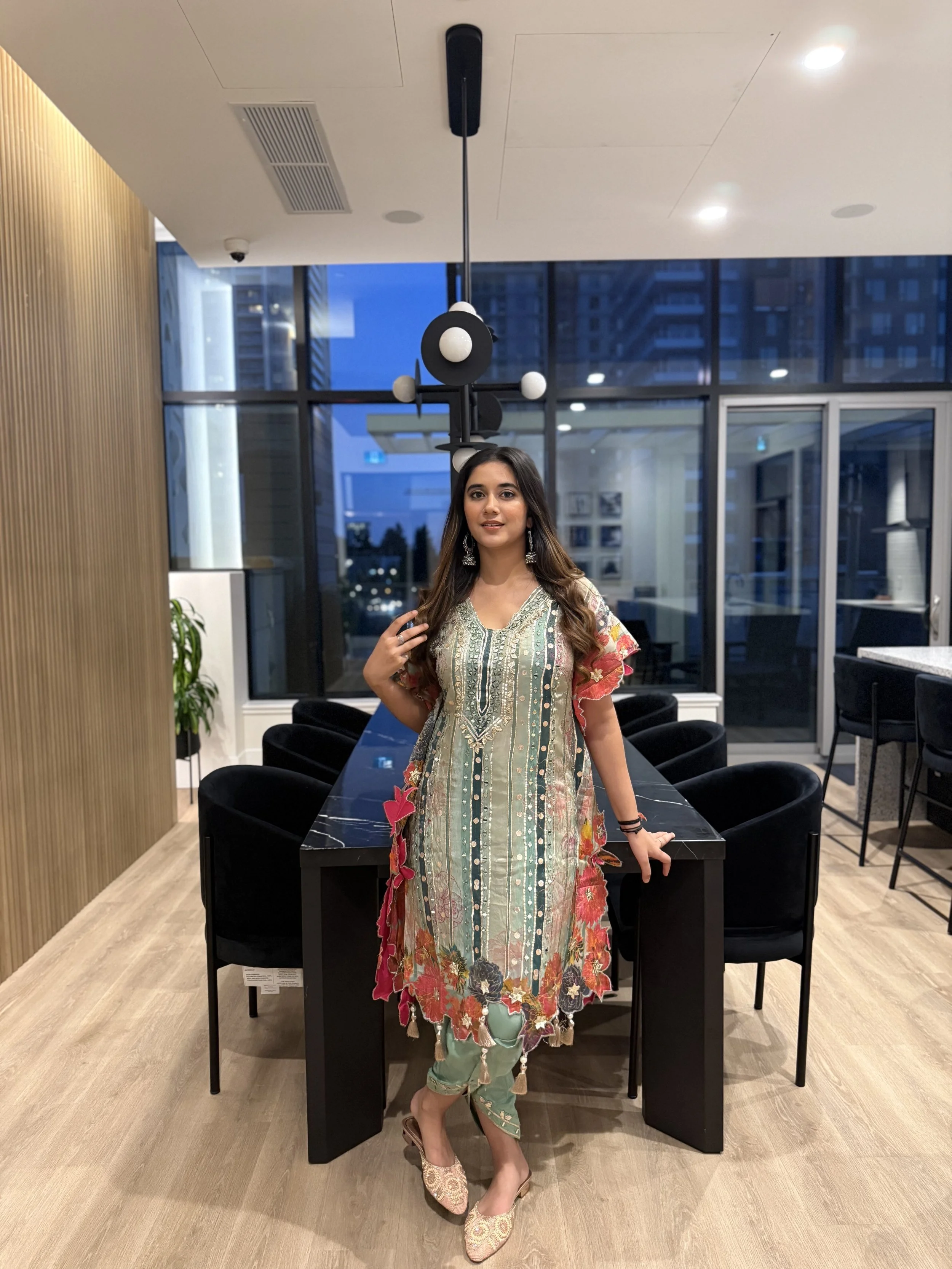 This green and gold embroidered georgette co-ord set redefines modern ethnic luxury. Featuring exquisite Zarkan and thread embroidery across the blouse, palazzo, and jacket, the design combines traditional artistry with a contemporary cut. Lightweight yet opulent, it’s the perfect pick for evening functions or intimate festive gatherings.