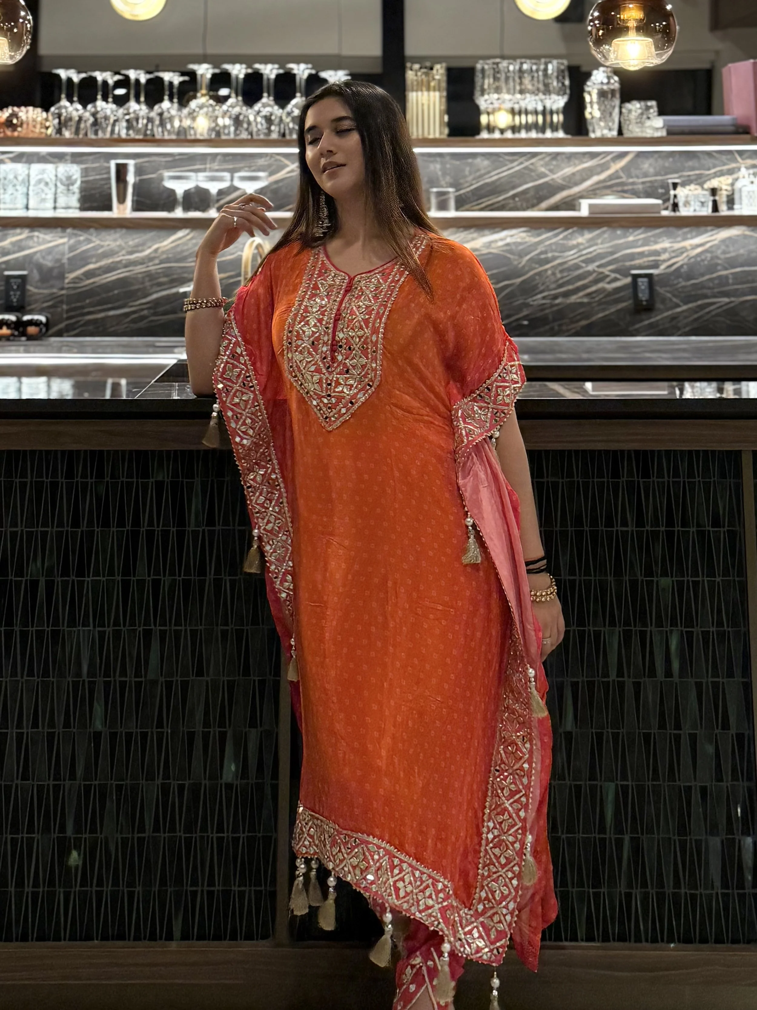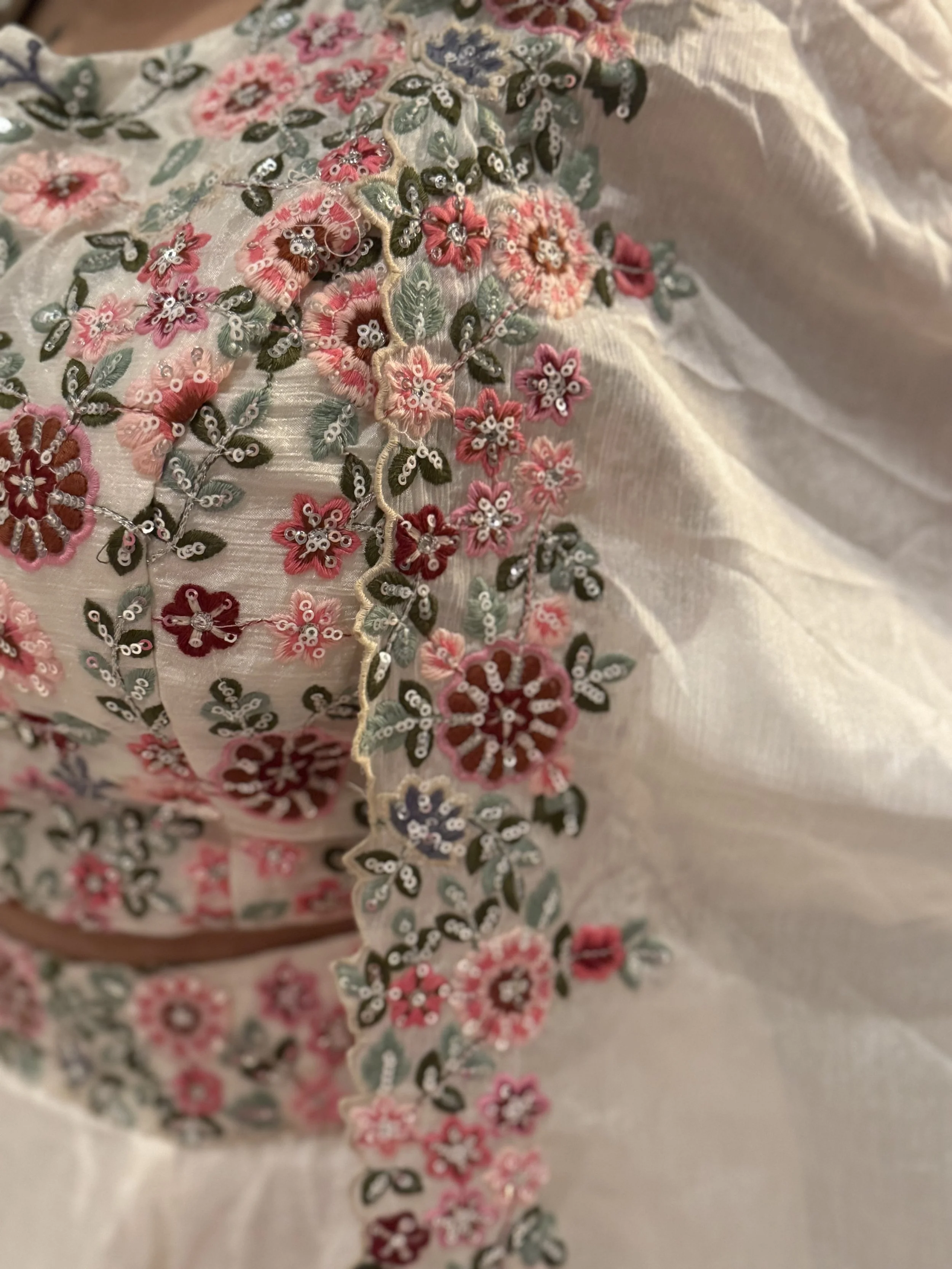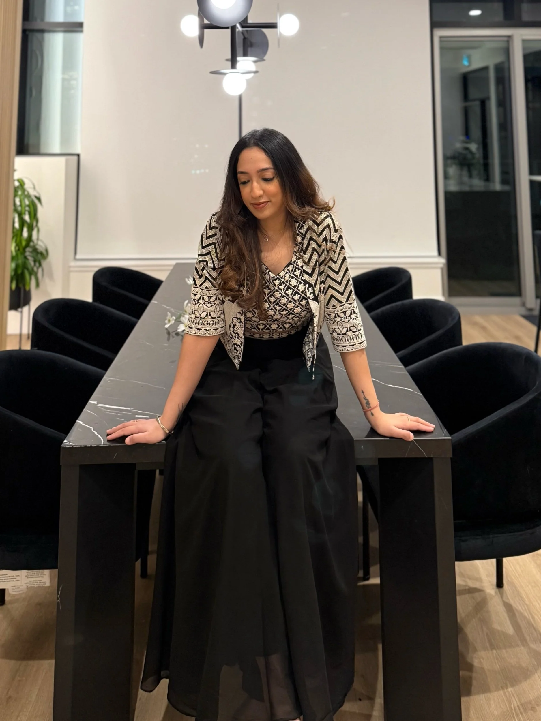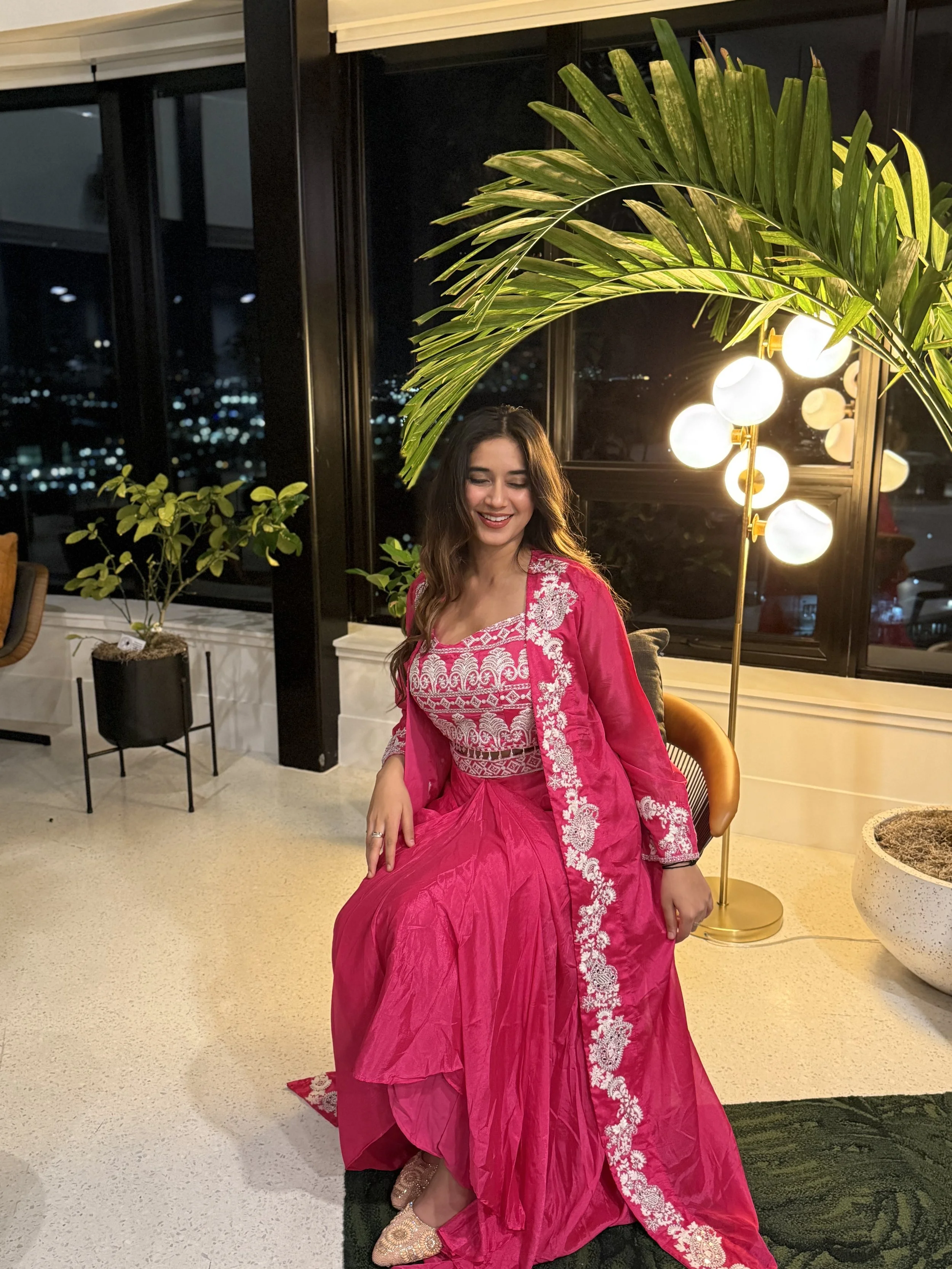 This green and gold embroidered georgette co-ord set redefines modern ethnic luxury. Featuring exquisite Zarkan and thread embroidery across the blouse, palazzo, and jacket, the design combines traditional artistry with a contemporary cut. Lightweight yet opulent, it’s the perfect pick for evening functions or intimate festive gatherings.