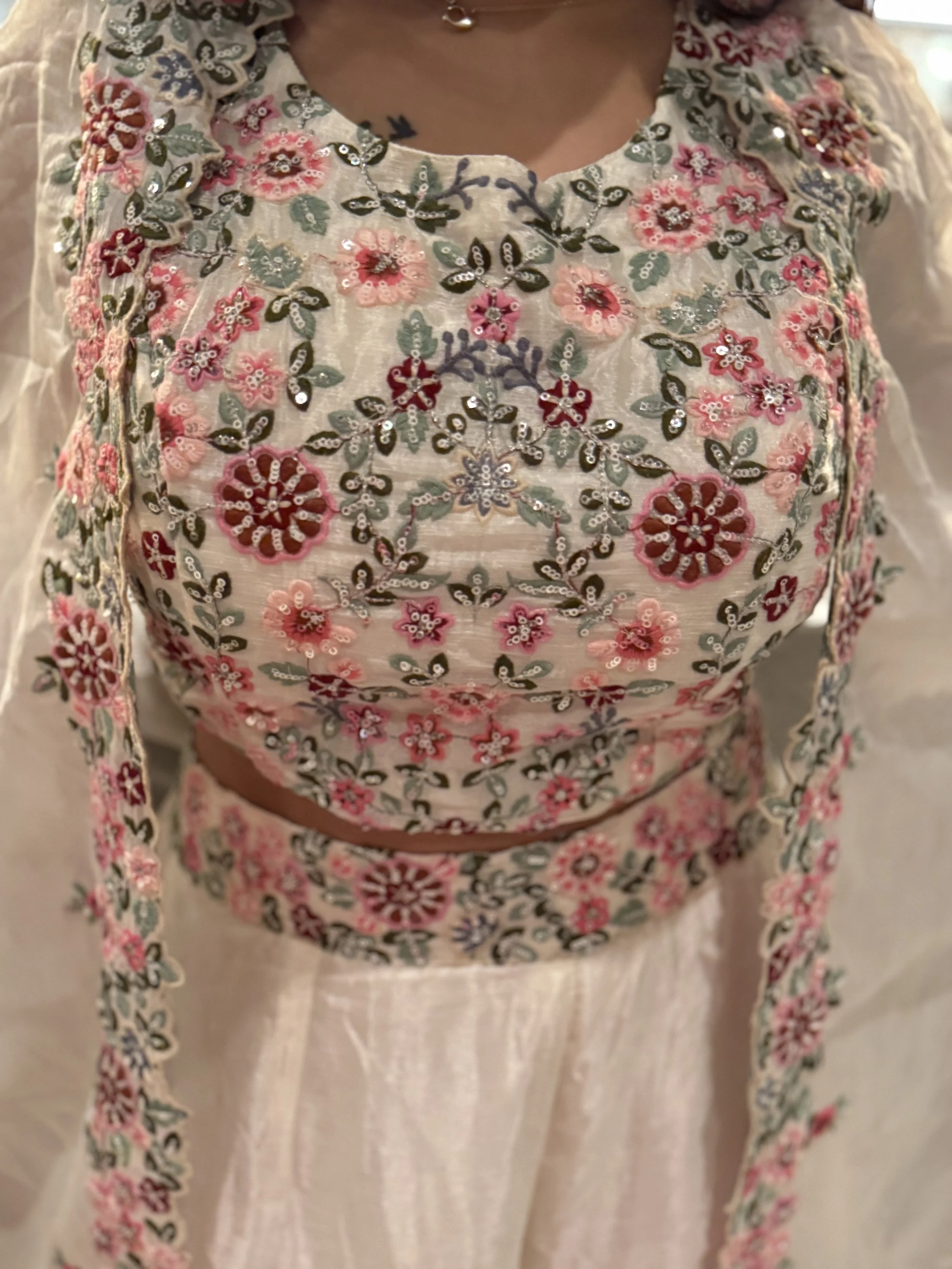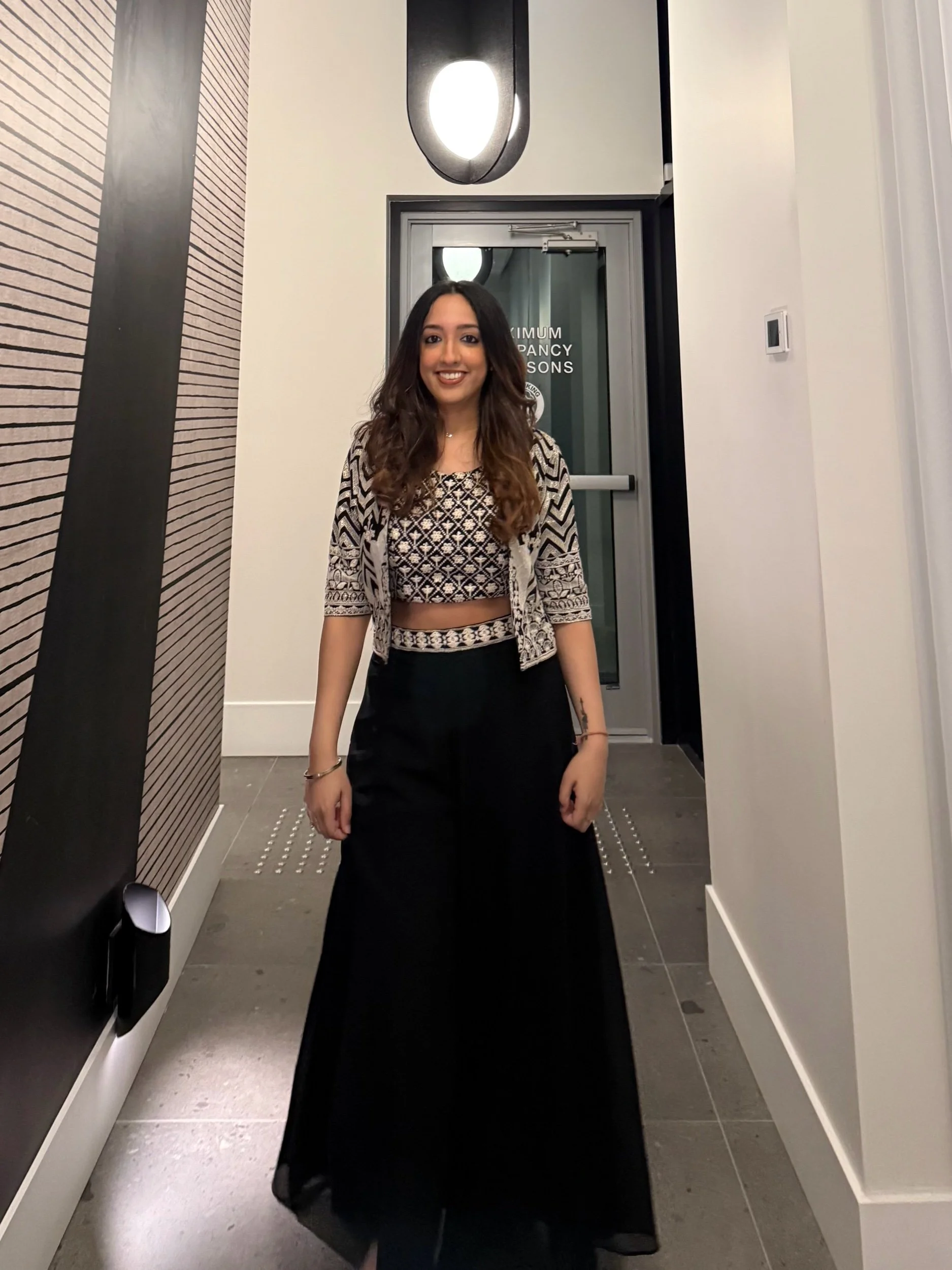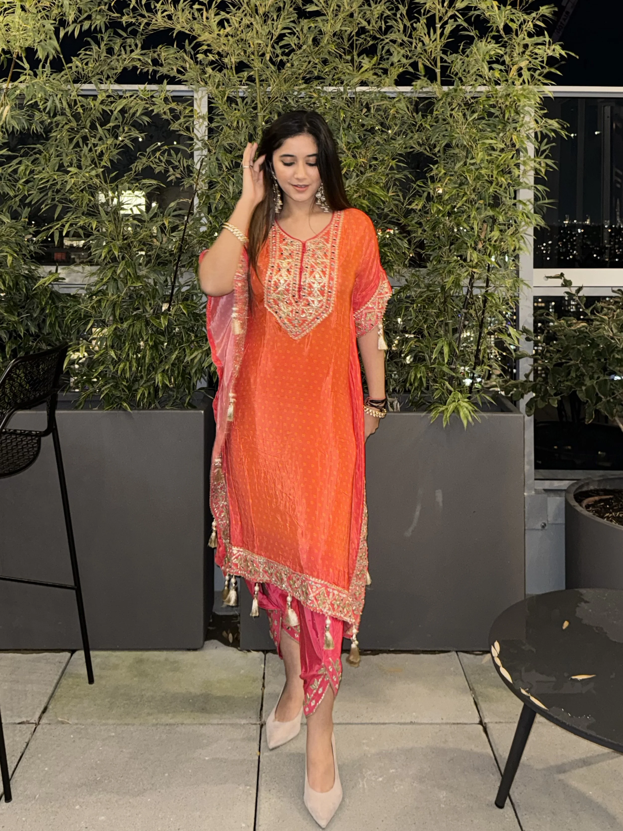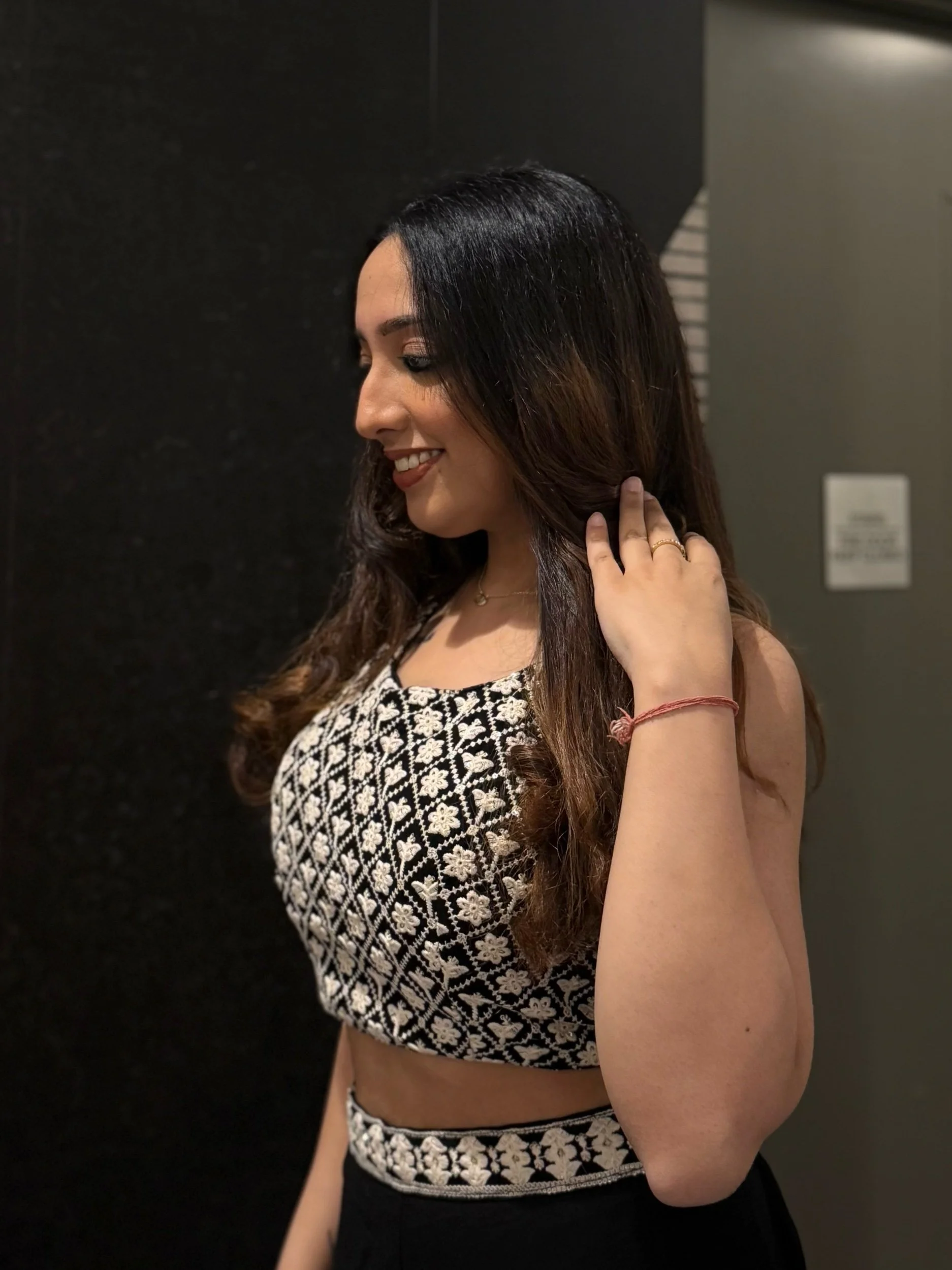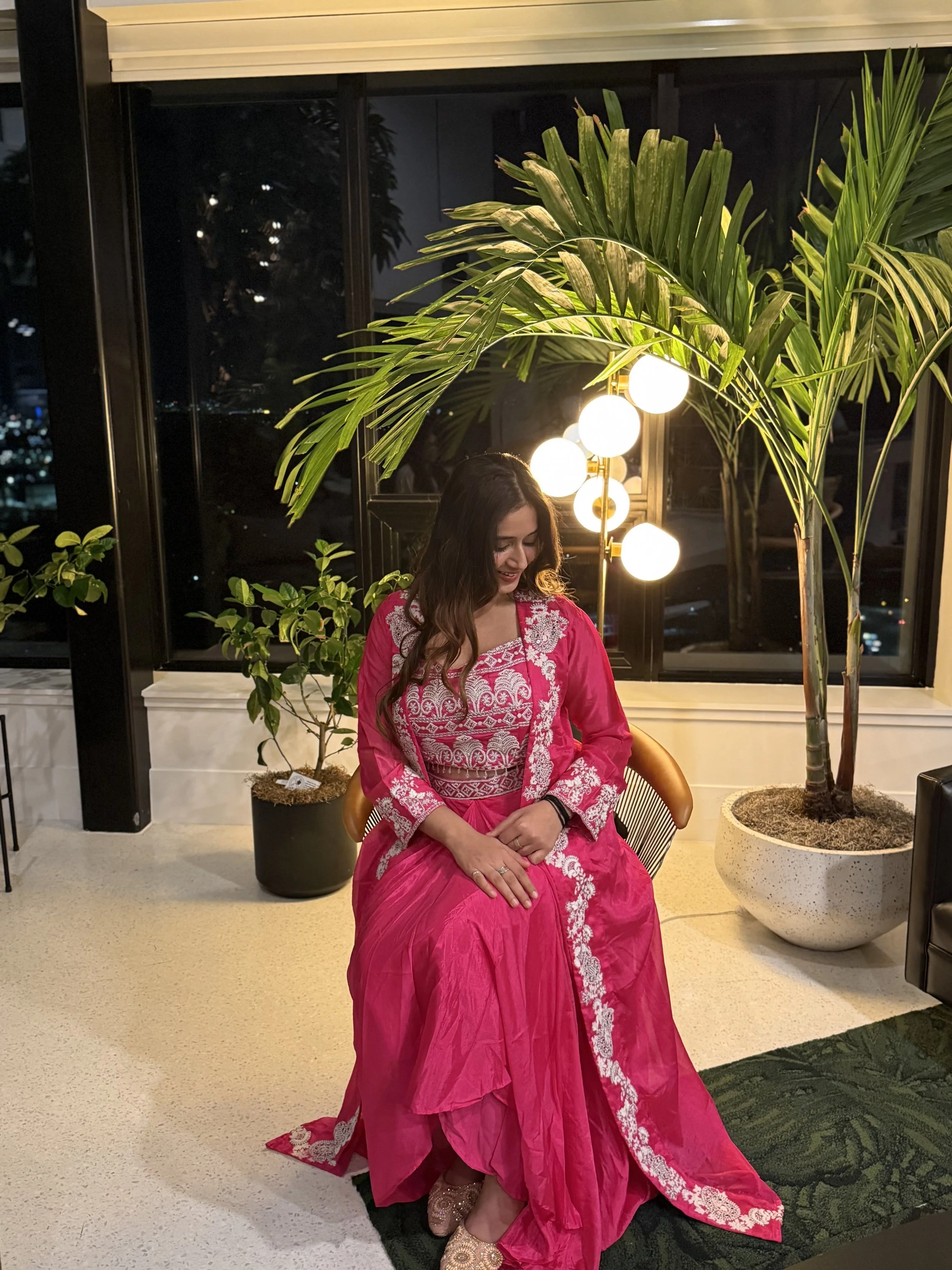 This green and gold embroidered georgette co-ord set redefines modern ethnic luxury. Featuring exquisite Zarkan and thread embroidery across the blouse, palazzo, and jacket, the design combines traditional artistry with a contemporary cut. Lightweight yet opulent, it’s the perfect pick for evening functions or intimate festive gatherings.