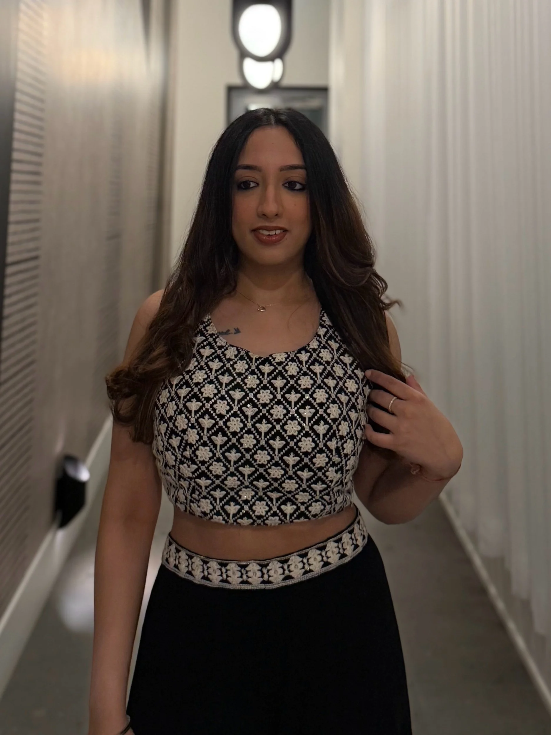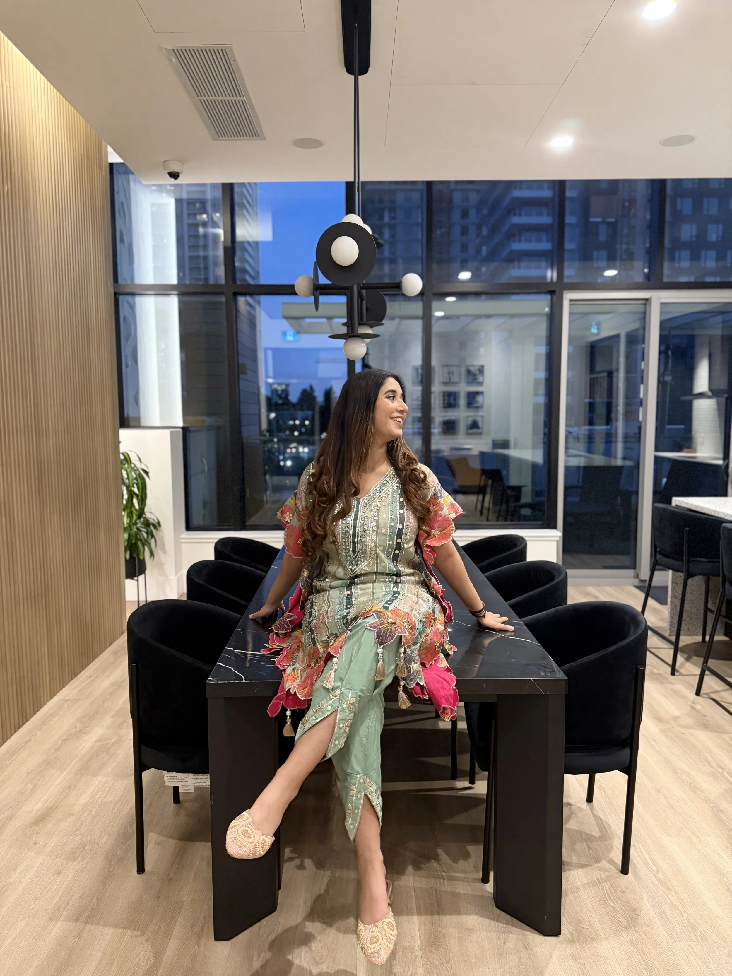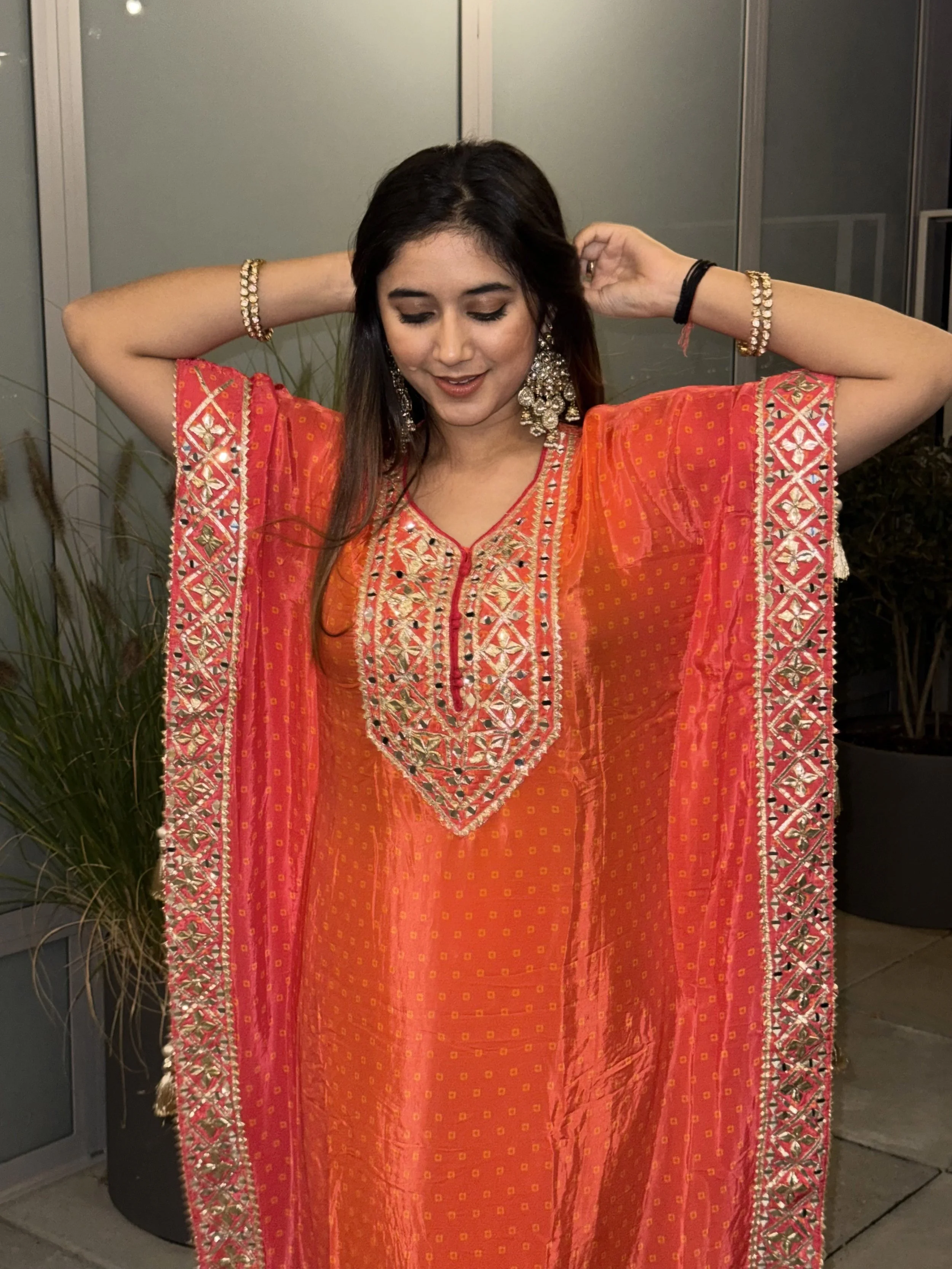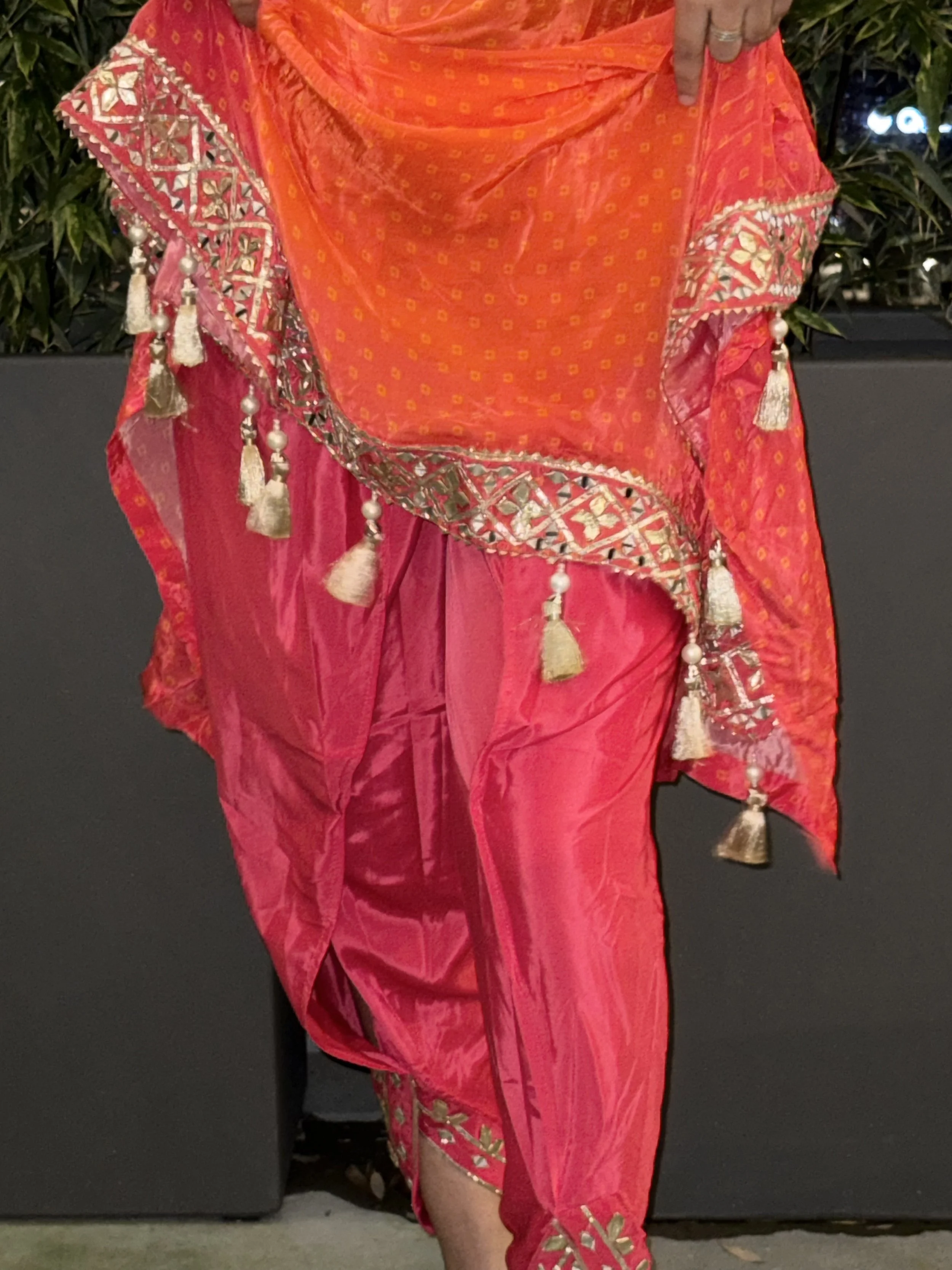 This green and gold embroidered georgette co-ord set redefines modern ethnic luxury. Featuring exquisite Zarkan and thread embroidery across the blouse, palazzo, and jacket, the design combines traditional artistry with a contemporary cut. Lightweight yet opulent, it’s the perfect pick for evening functions or intimate festive gatherings.
